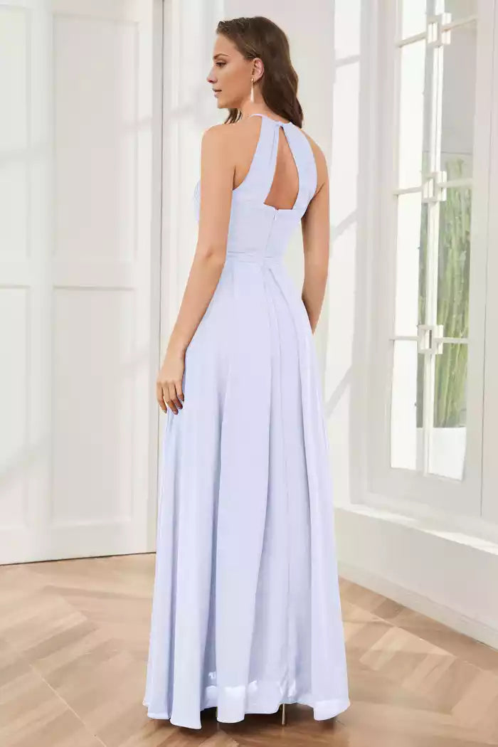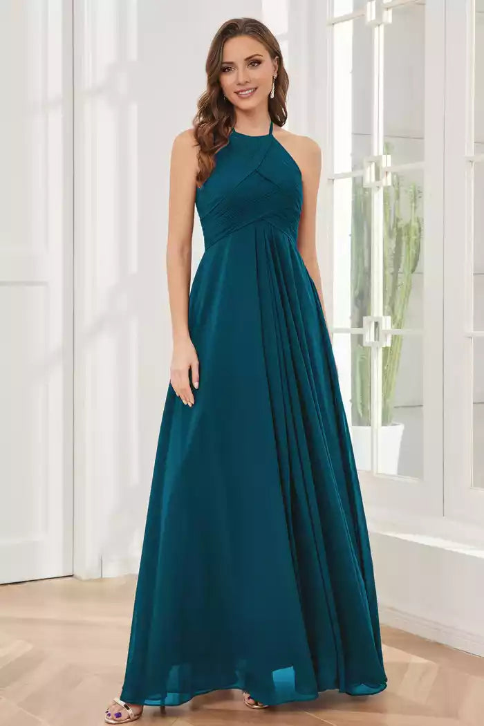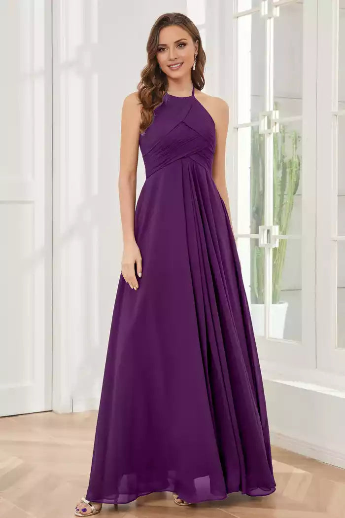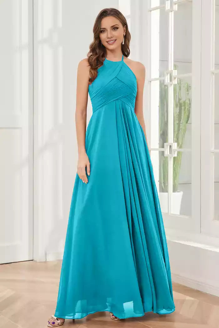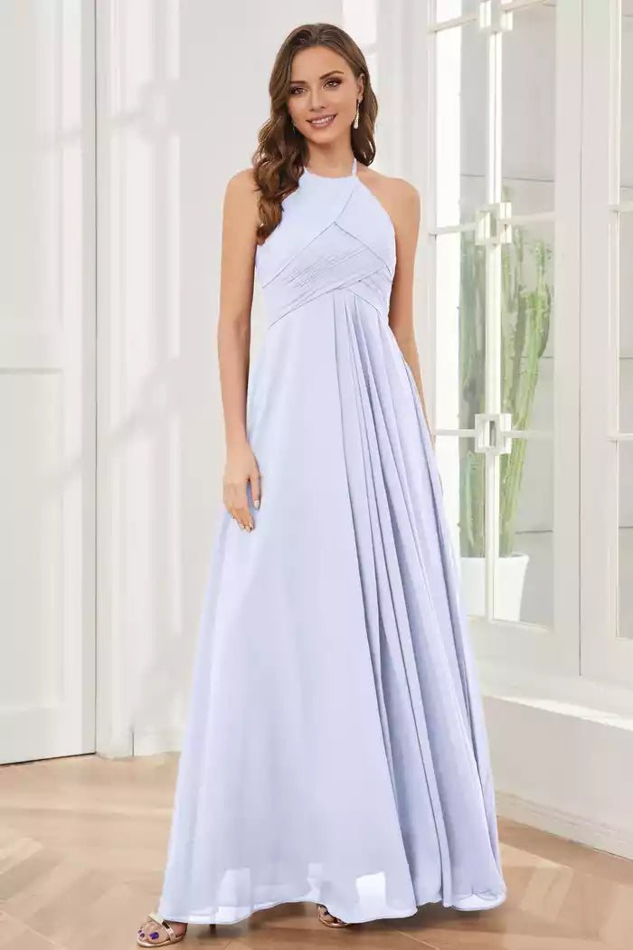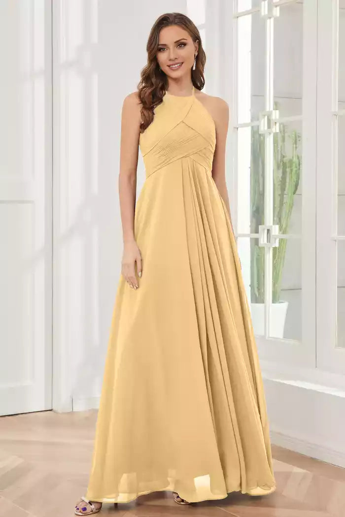 These bridesmaid dresses feature an A-line silhouette with a floor-length design and a halter neckline, crafted from lightweight chiffon for an elegant and flowing appearance.