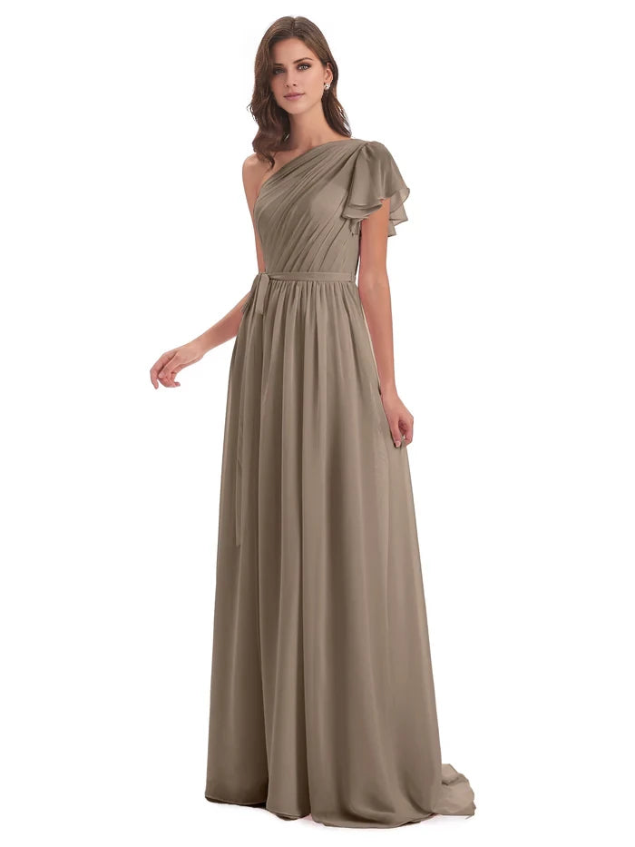 This elegant chiffon bridesmaid dress features a one-shoulder design with an A-line silhouette and a sweep-brush train, creating a graceful and sophisticated look for any formal occasion.
