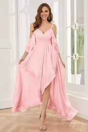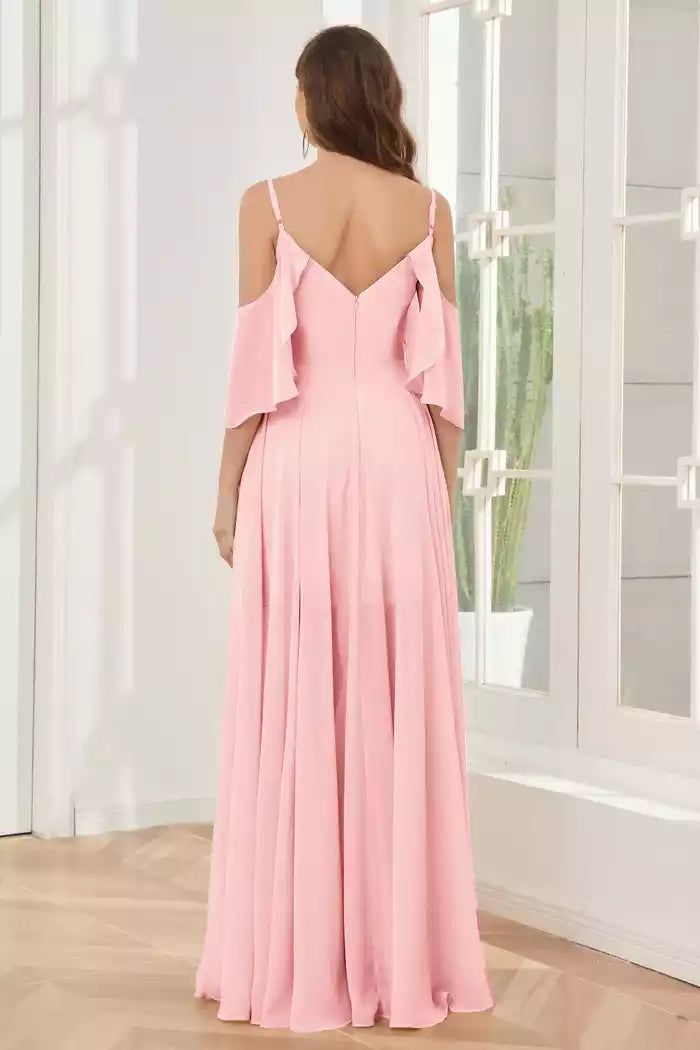 Asymmetrical Off the Shoulder Ruffles Chiffon Bridesmaid Dresses - Blush / US 2 / UK 6 / EU 32