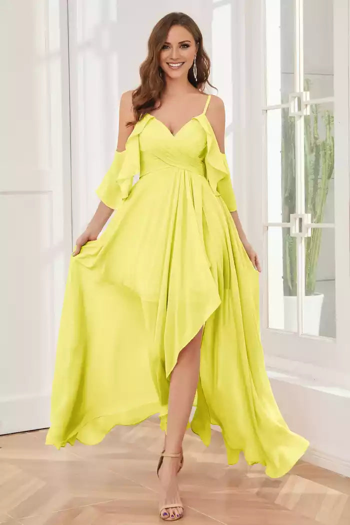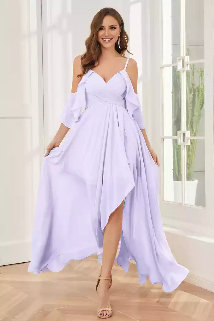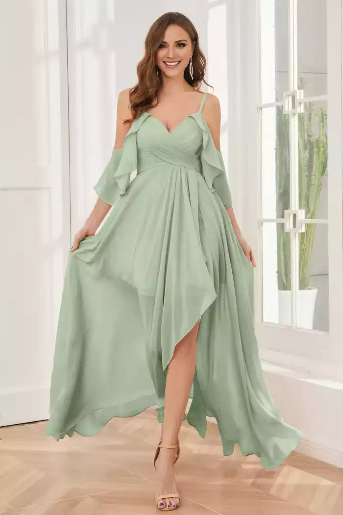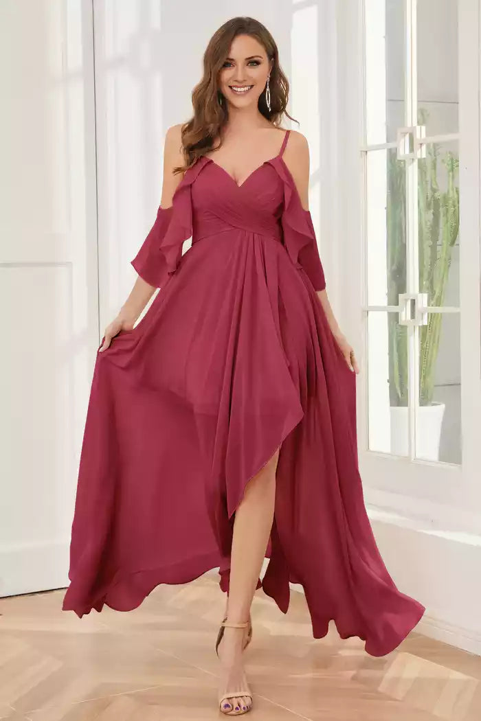 These chiffon bridesmaid dresses feature an asymmetrical off-the-shoulder design with elegant ruffles, combining sophistication and modern style for a refined bridal party look.