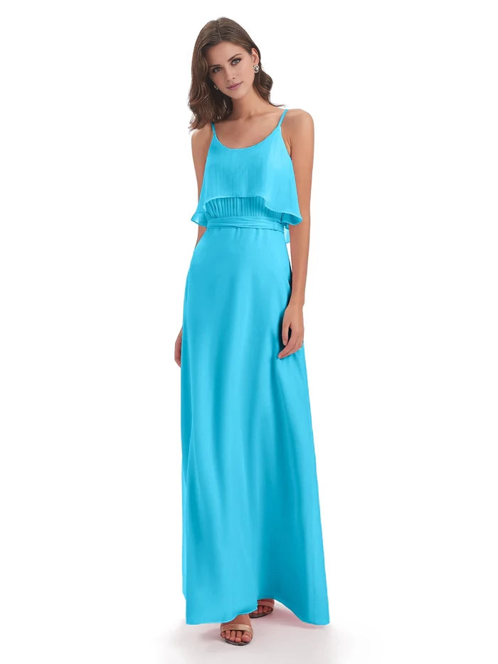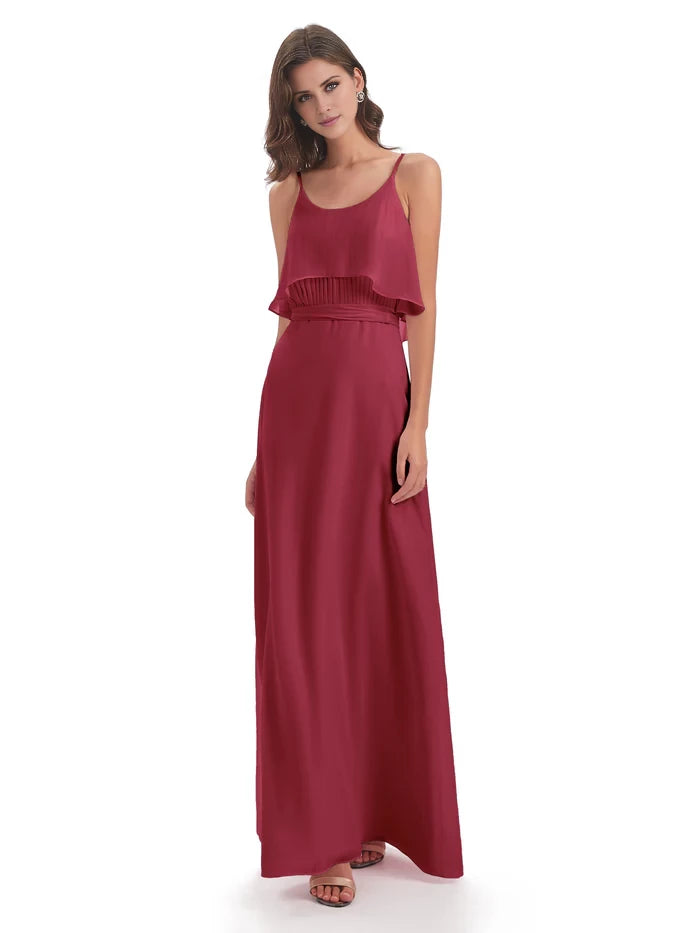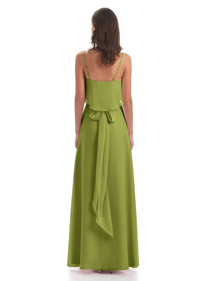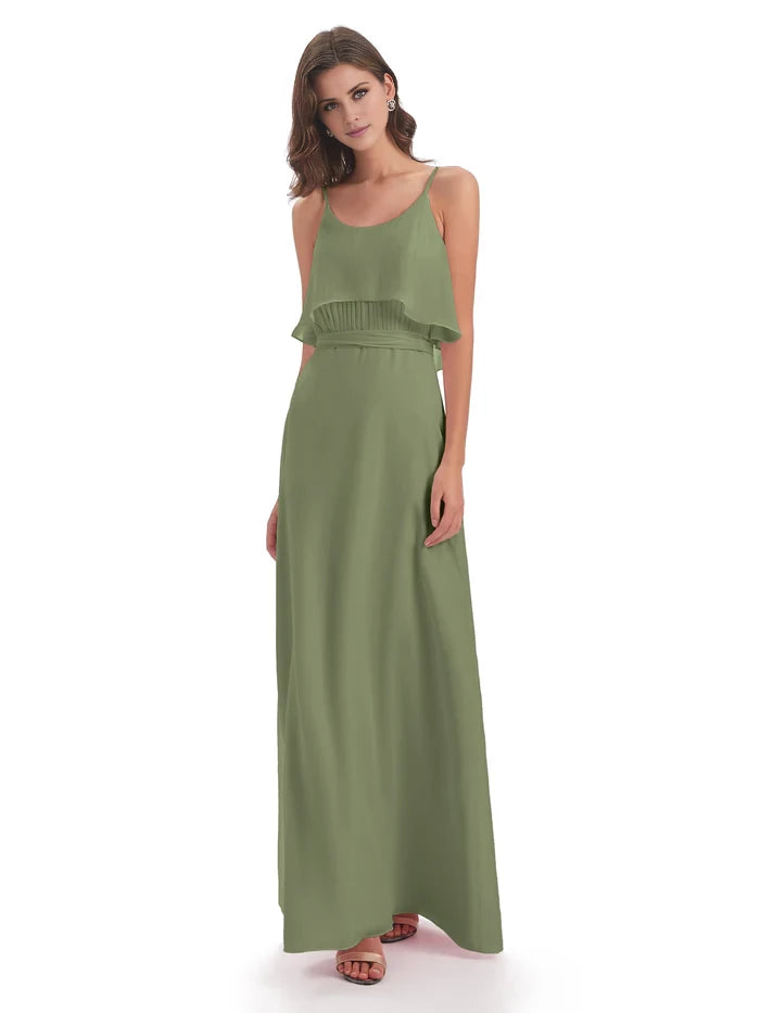 This elegant bridesmaid dress features a column silhouette with floor-length chiffon fabric and delicate spaghetti straps, offering a refined and graceful look for any formal occasion.