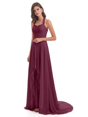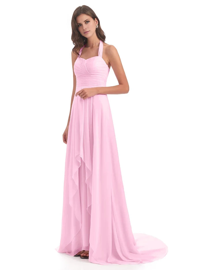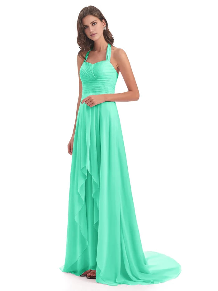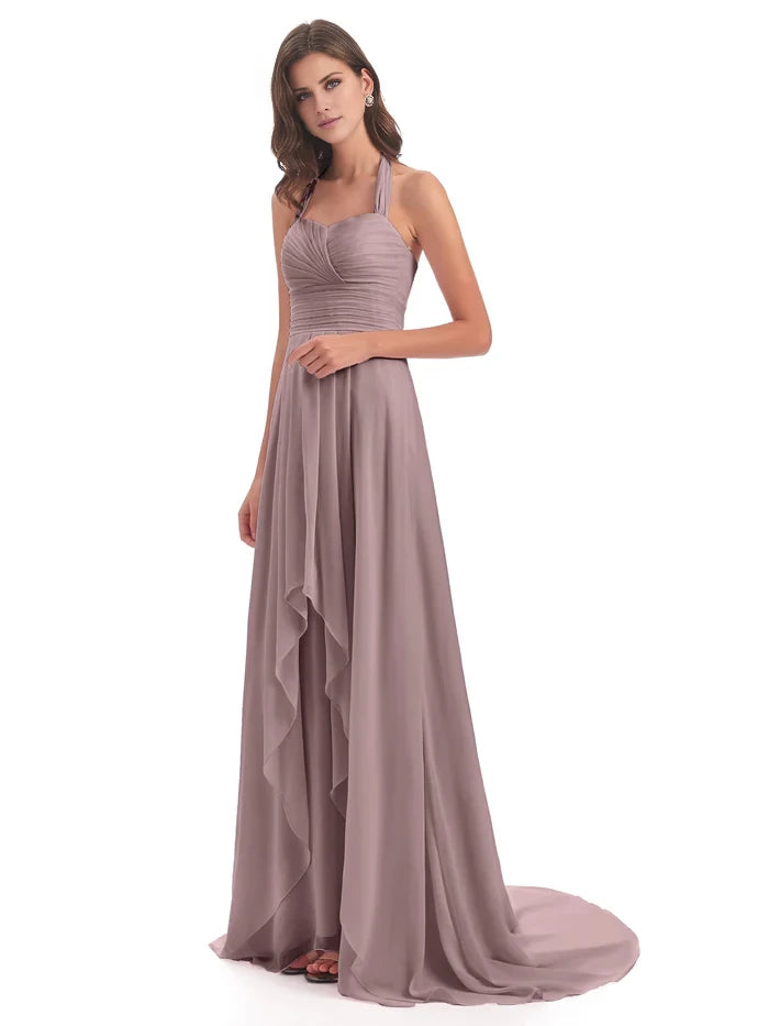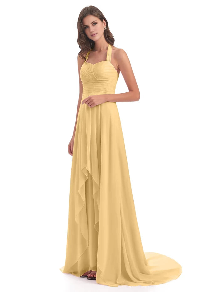 Elegant chiffon bridesmaid dresses featuring a high-low hem and halter neckline with a court train design.