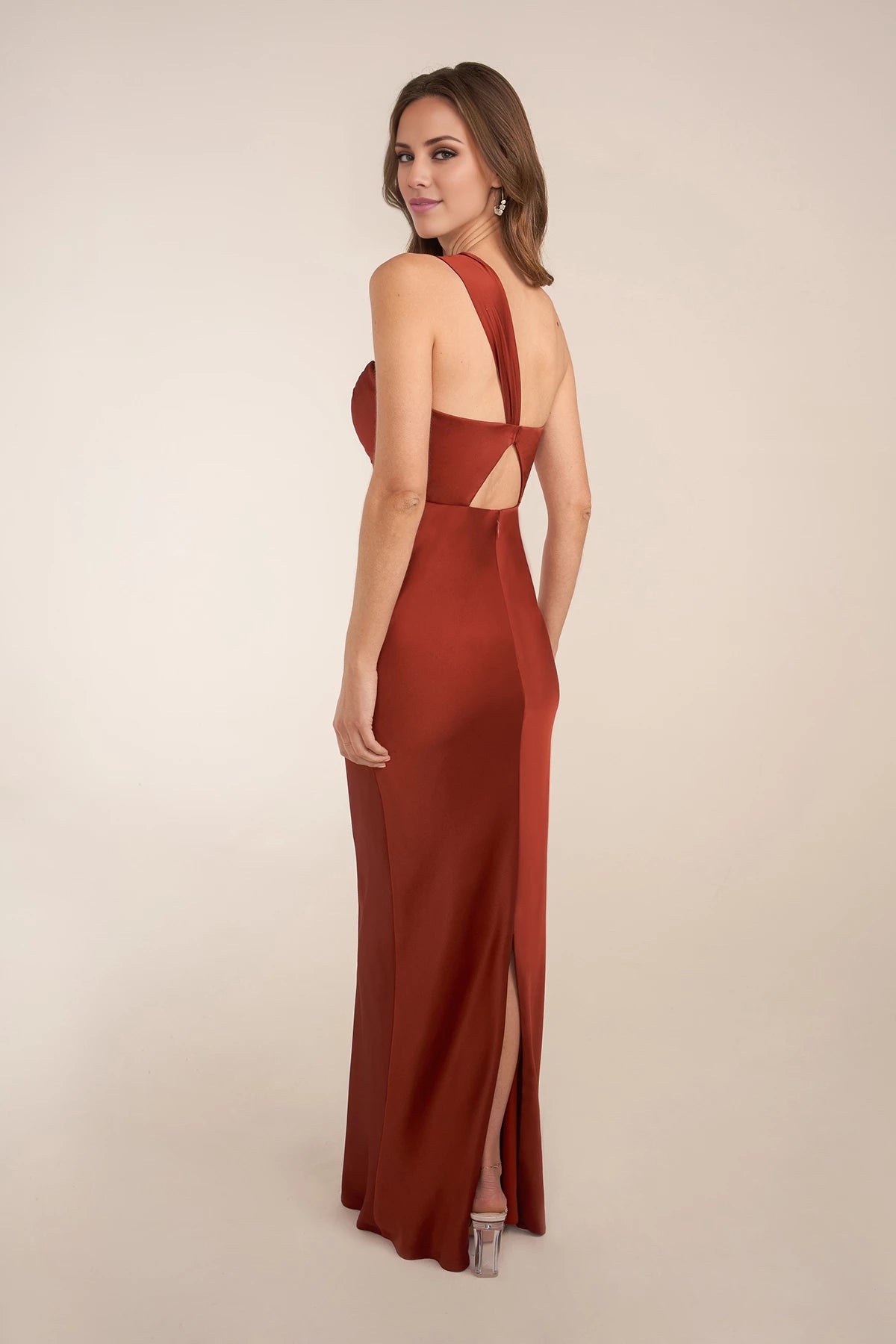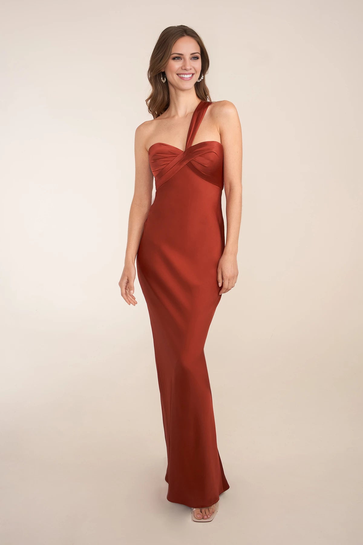 This elegant floor-length bridesmaid dress features a sleek sheath silhouette with a one-shoulder neckline and sleeveless design, completed with a discreet back zipper for a refined fit.