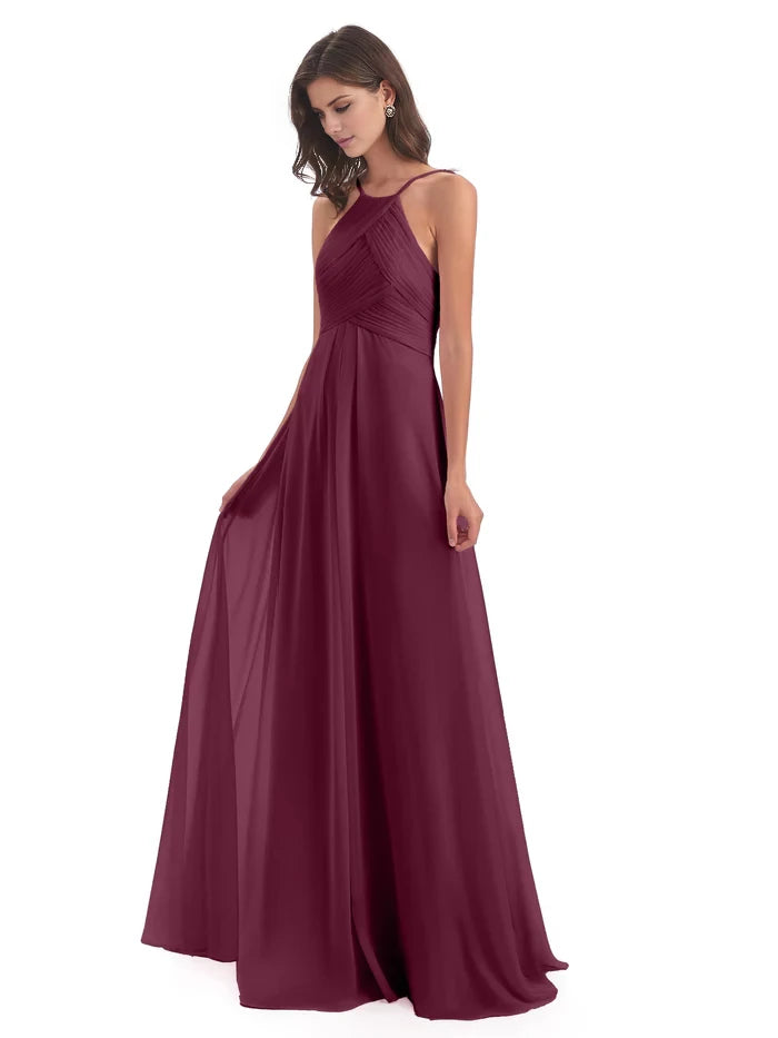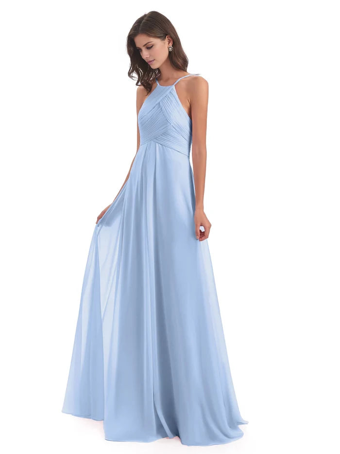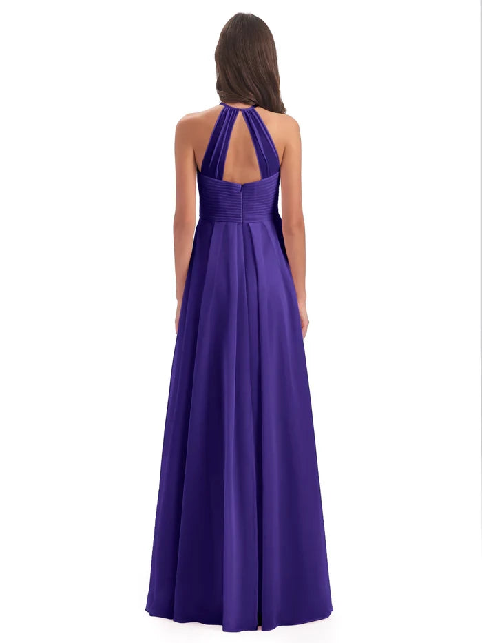 Elegant chiffon bridesmaid gowns featuring a floor-length design with a halter neckline and a keyhole detail.