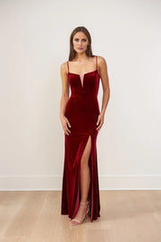 This elegant velvet fit-and-flare gown features a distinctive V-notch square neckline and delicate spaghetti straps, making it an ideal choice for bridesmaids seeking a sophisticated and flattering silhouette.