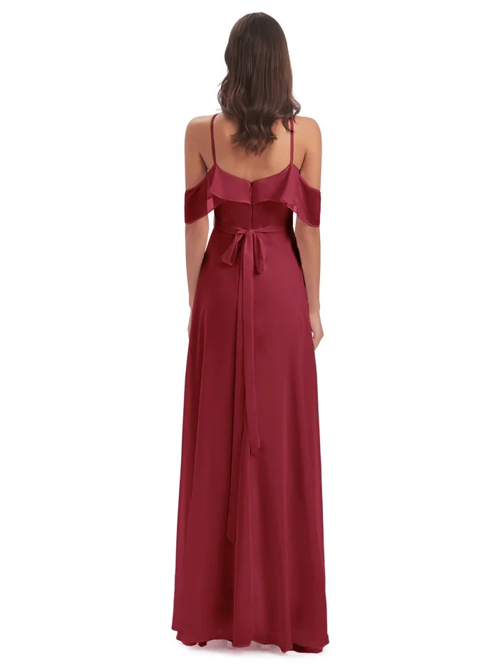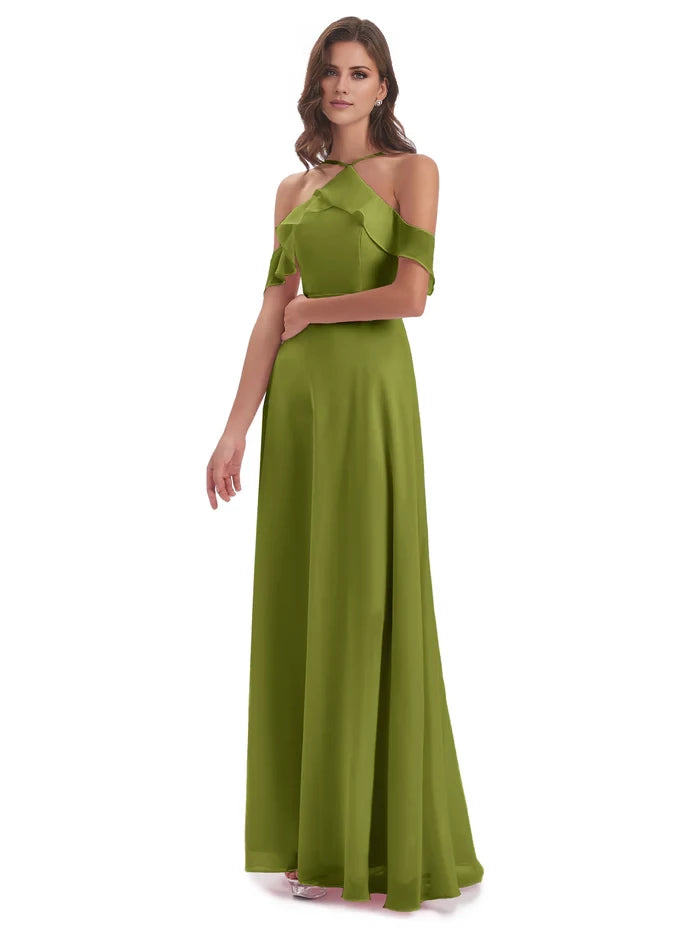 These long bridesmaid dresses feature a halter neckline combined with an off-the-shoulder design, crafted from flowing chiffon fabric for an elegant and graceful look.