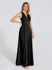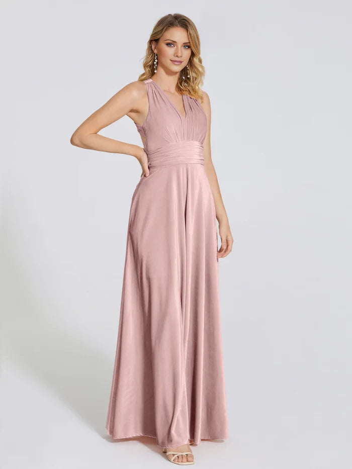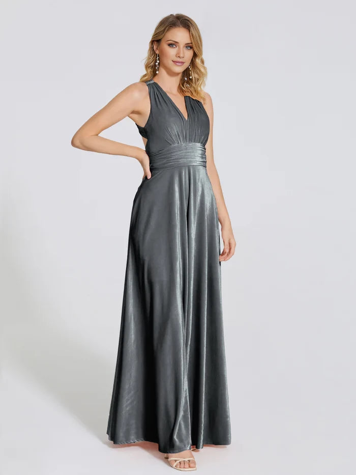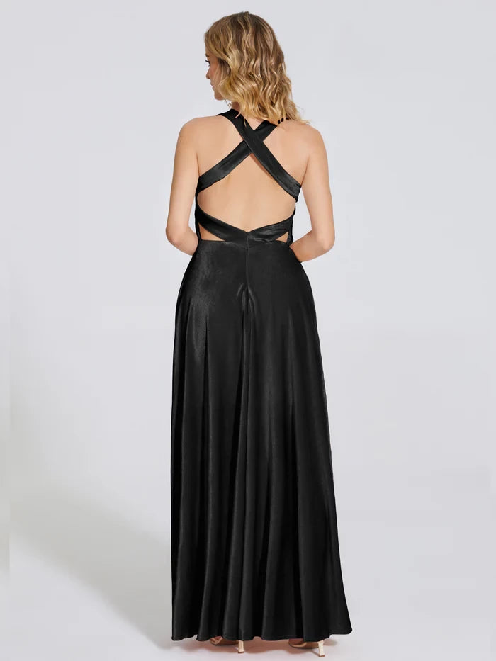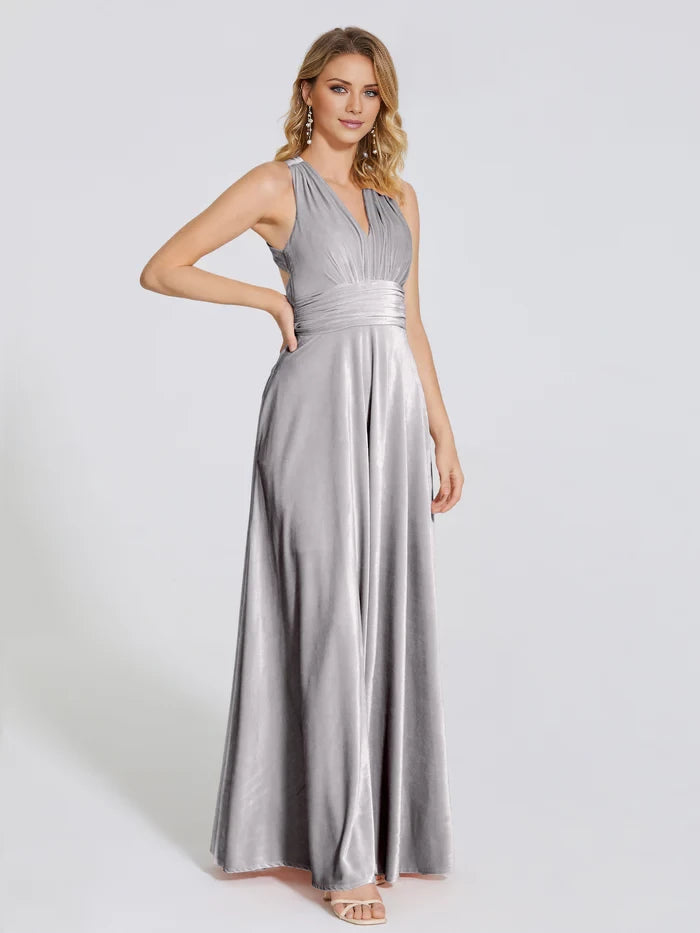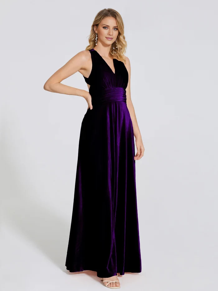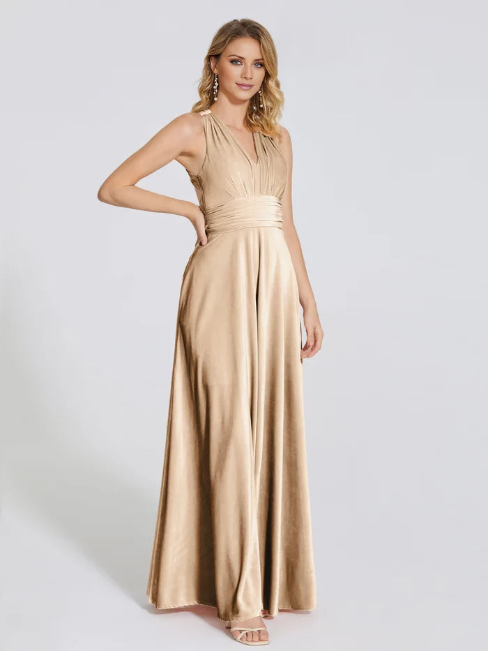 This bridesmaid dress features halter straps and an empire waist, crafted from luxurious velvet for an elegant and flattering silhouette.
