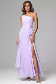 This bridesmaid dress features a one-shoulder design with a lace-up back, crafted from flowing chiffon fabric. Its split fork detail adds elegance and movement, making it a sophisticated choice for any wedding party.