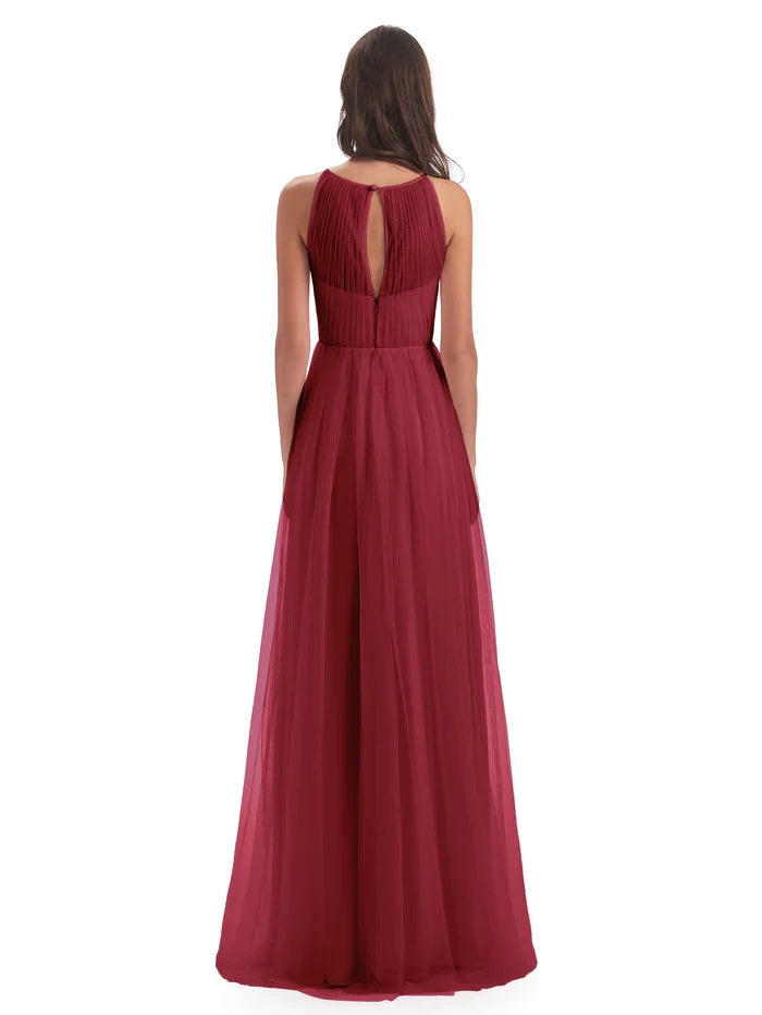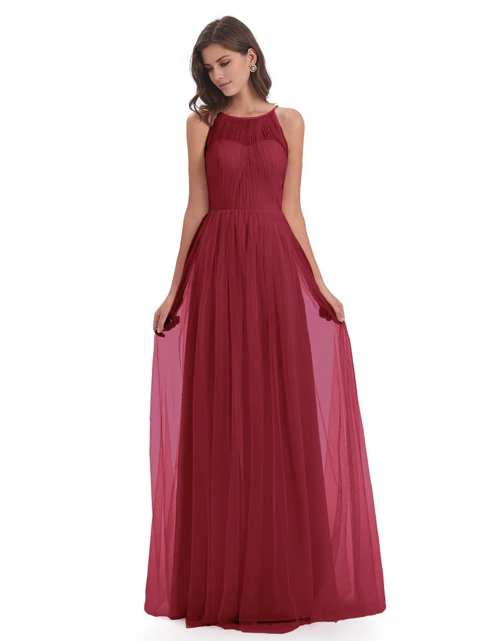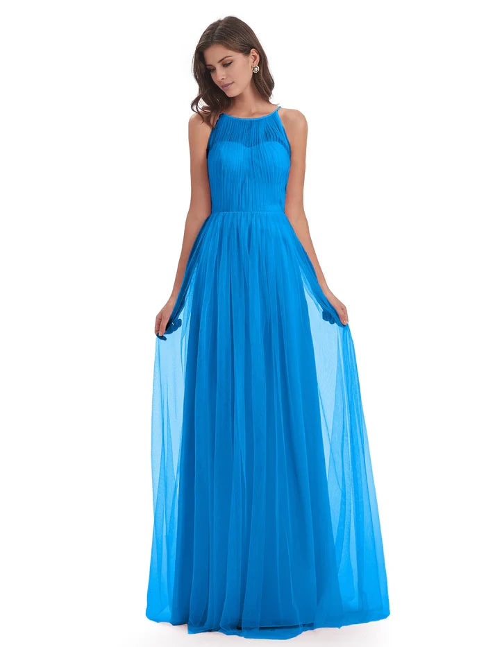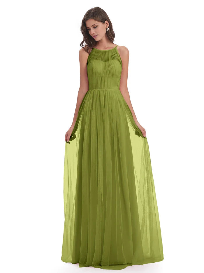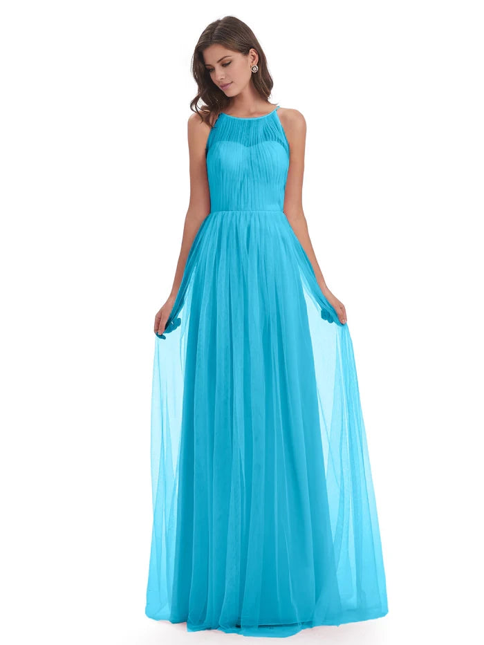 Elegant off-the-shoulder halter bridesmaid gowns crafted from floor-length tulle fabric.
