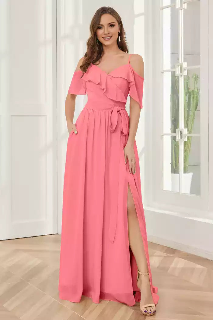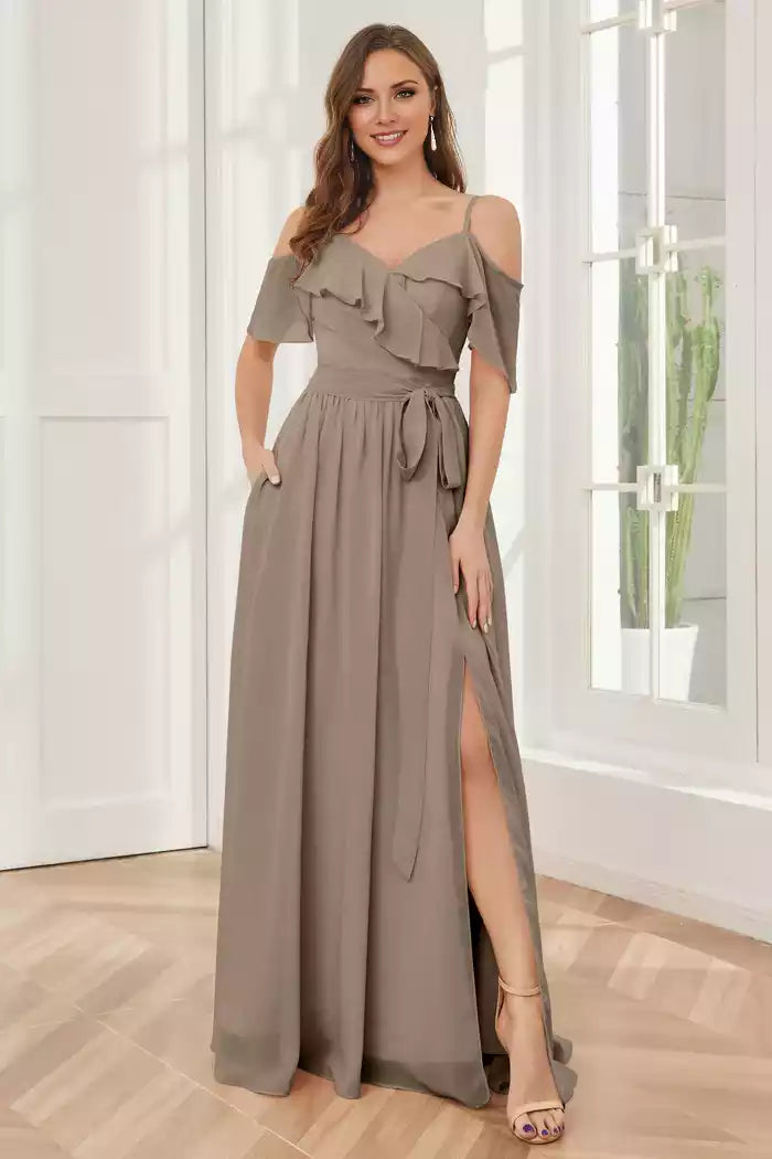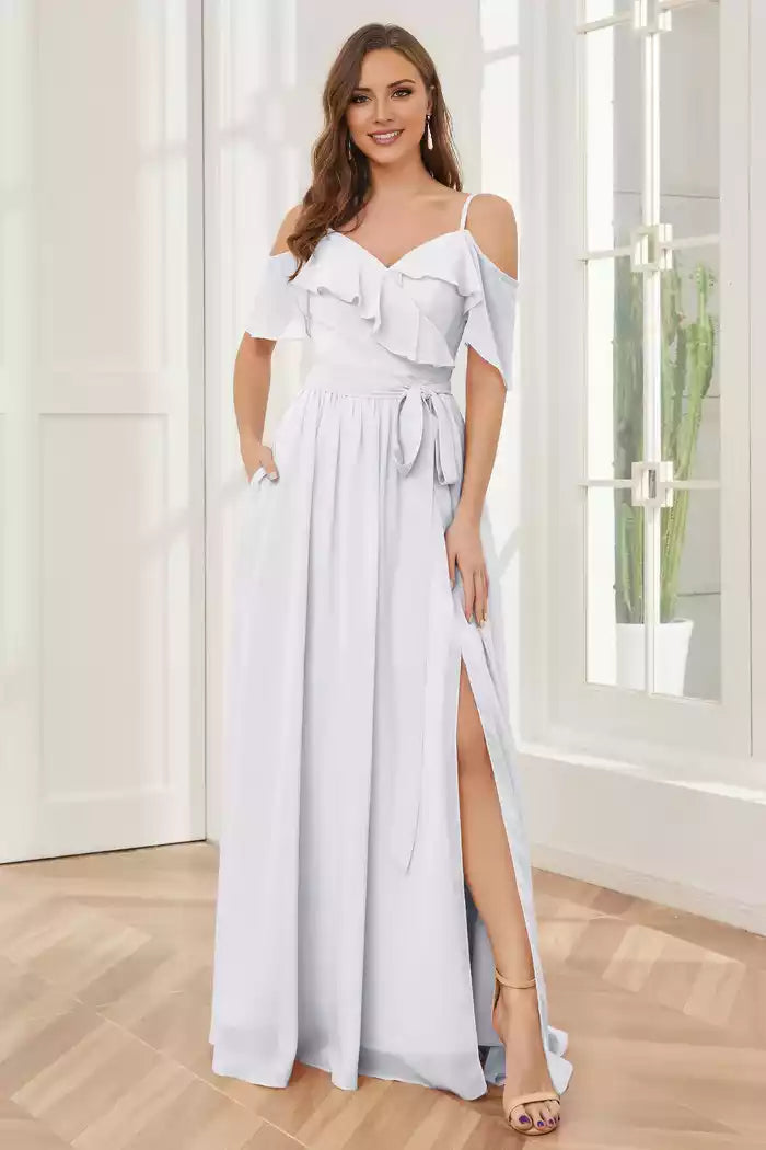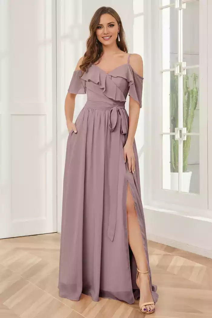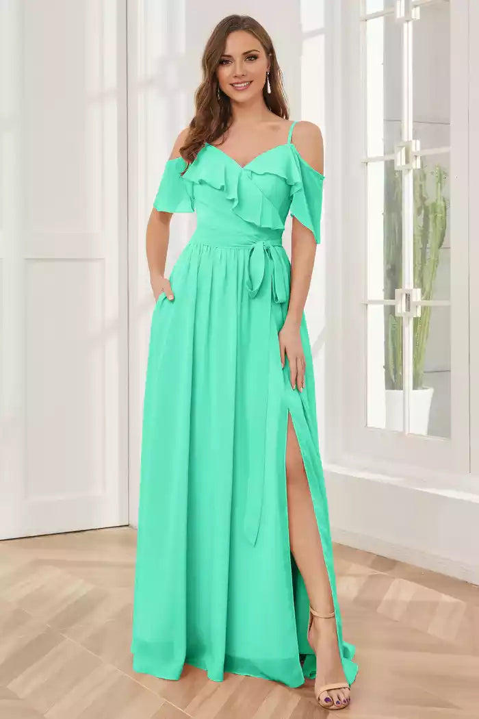 This chiffon bridesmaid dress features elegant off-the-shoulder ruffles and a stylish slit, combining sophistication with a graceful silhouette.