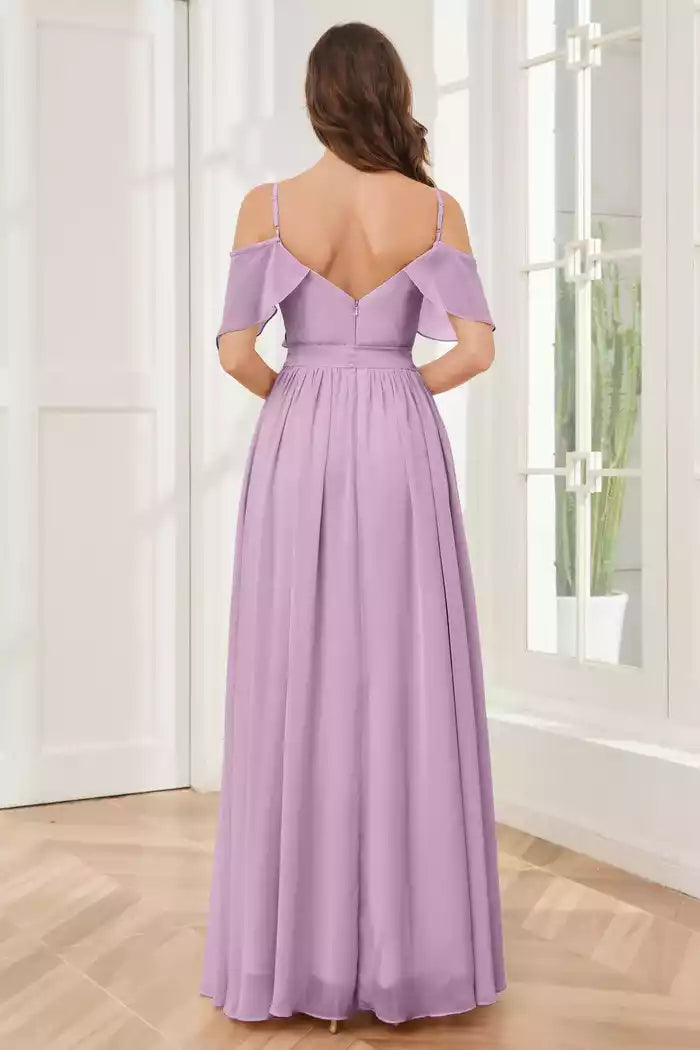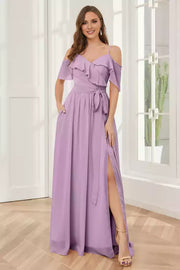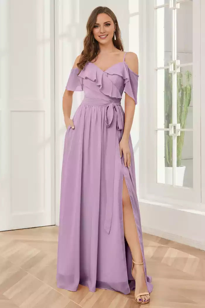 Off the Shoulder Ruffles Chiffon with Slit Bridesmaid Dresses - Wisteria / US 2 / UK 6 / EU 32