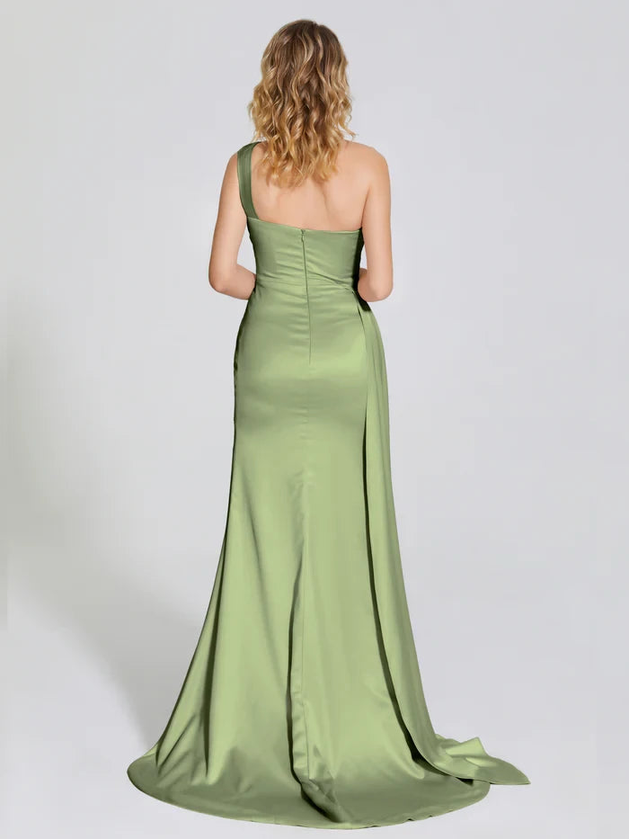 This elegant bridesmaid dress features a one-shoulder design crafted from soft satin, complemented by a stylish cutout detail for a modern and sophisticated look.