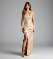 Simple One Shoulder Sleeveless Column Back Zip Floor-Length Side Slit Bridesmaid Dress