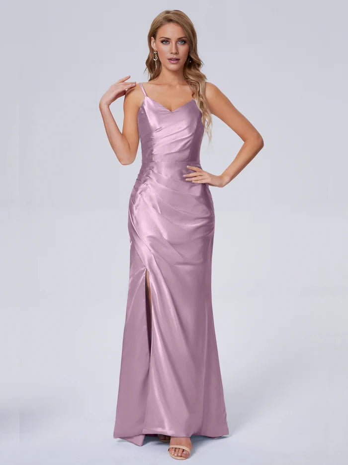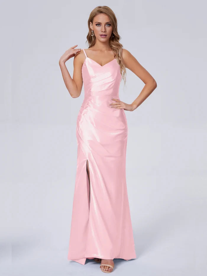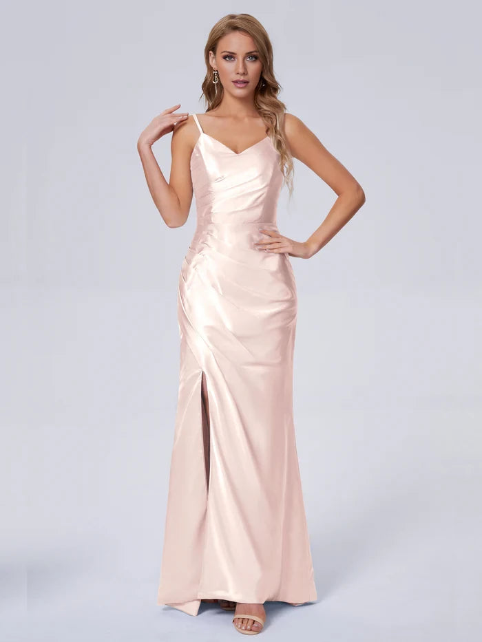 V-Neck Spaghetti Strap Satin Long Bridesmaid Dresses