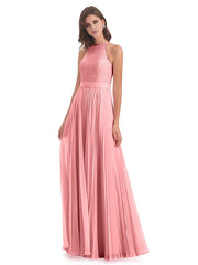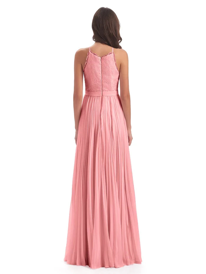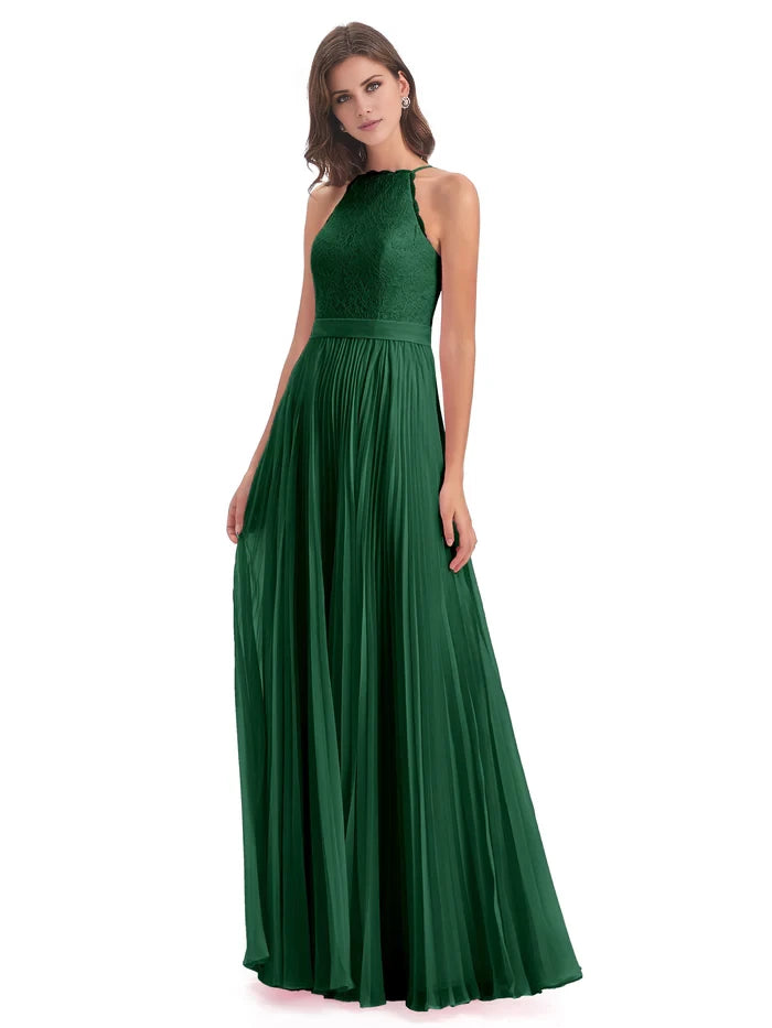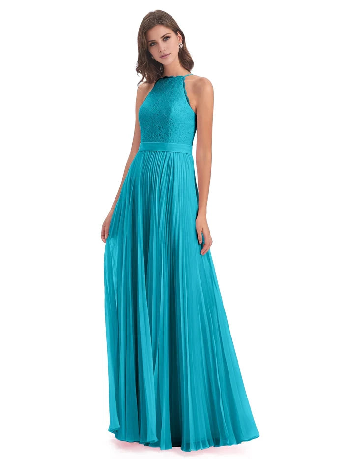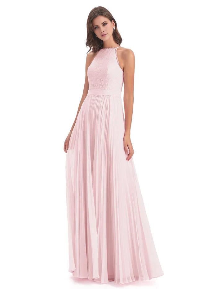 These bridesmaid dresses feature a sleeveless design with a floor-length silhouette and a halter neckline, crafted from delicate lace for an elegant finish.