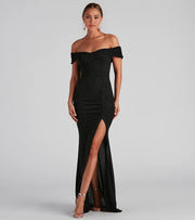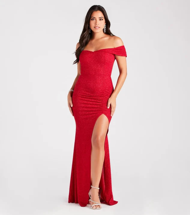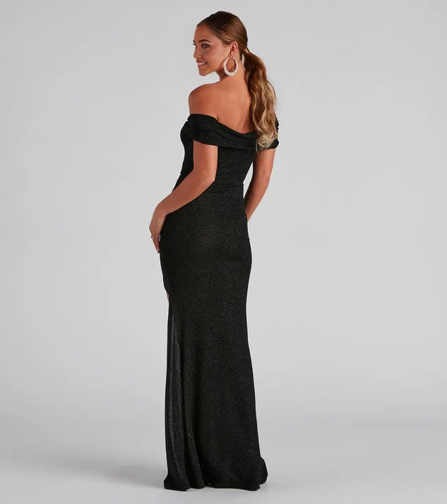 This stunning bridesmaid dress features a sparkling glitter finish, an off-the-shoulder neckline, and a sleek sheath silhouette. It is sleeveless and floor-length, with a side slit adding a touch of elegance and ease of movement.