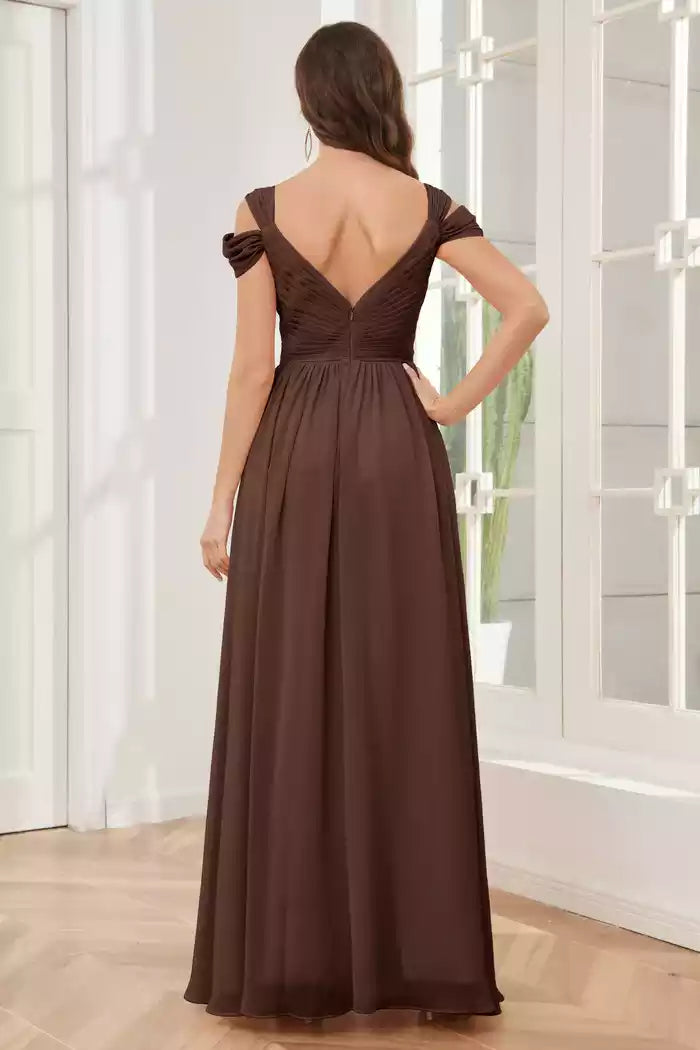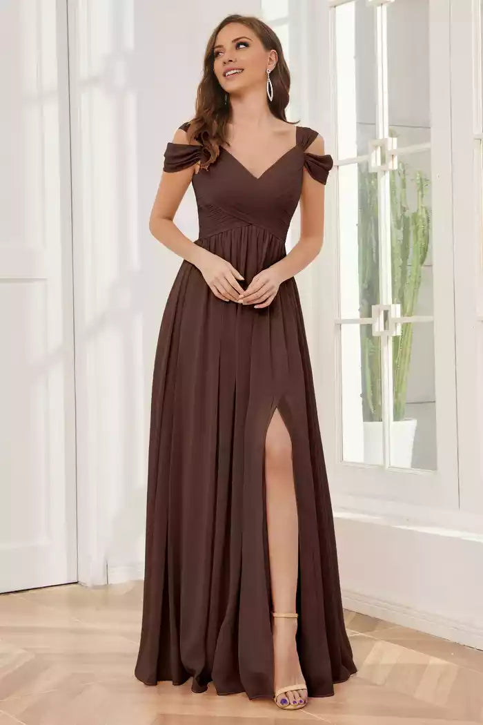V-Neck Backless Off-the-Shoulder Side Slit Empire Bridesmaid Dresses - Chocolate / US 2 / UK 6 / EU 32
