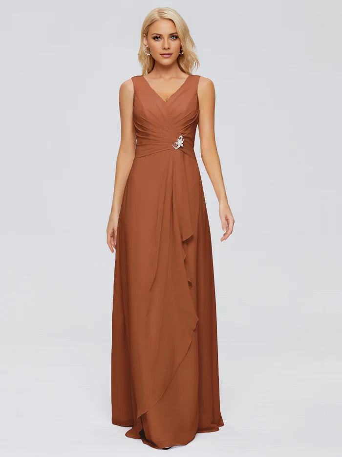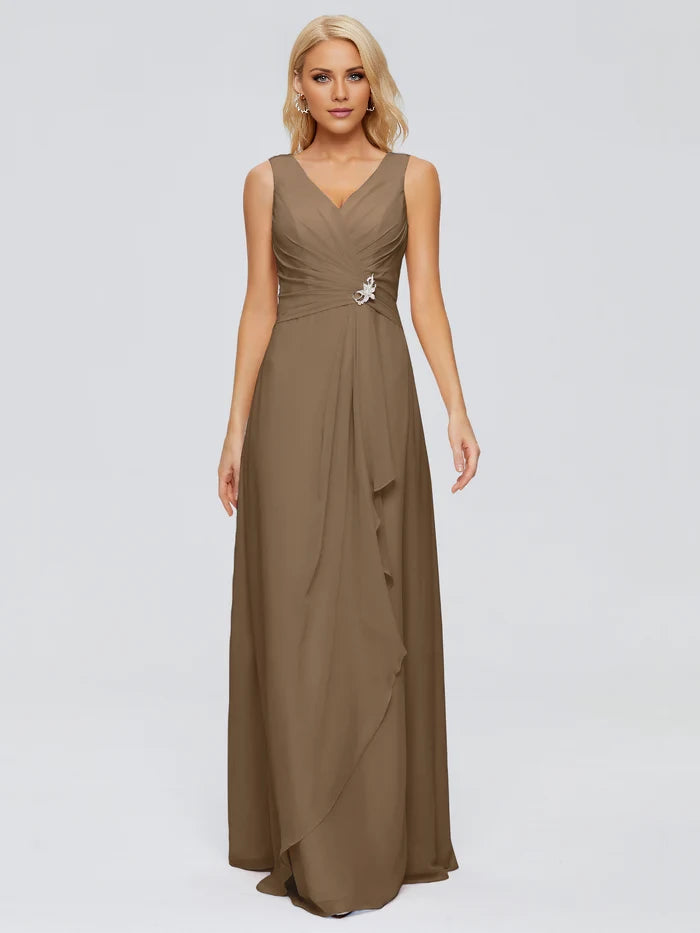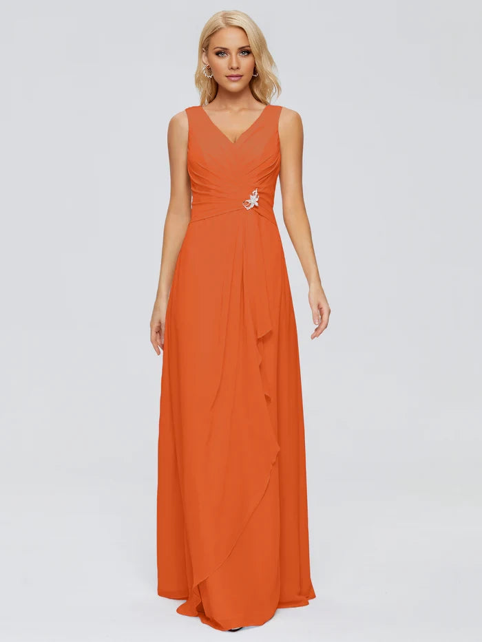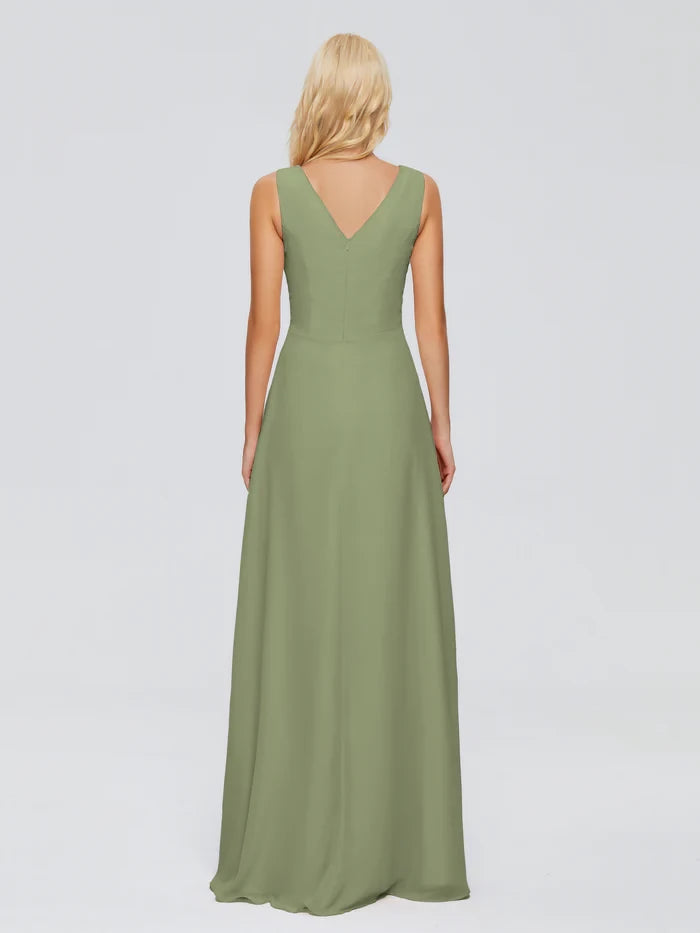 Sleeveless chiffon bridesmaid dresses featuring a V-neckline and a stylish twist-front design.