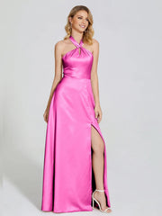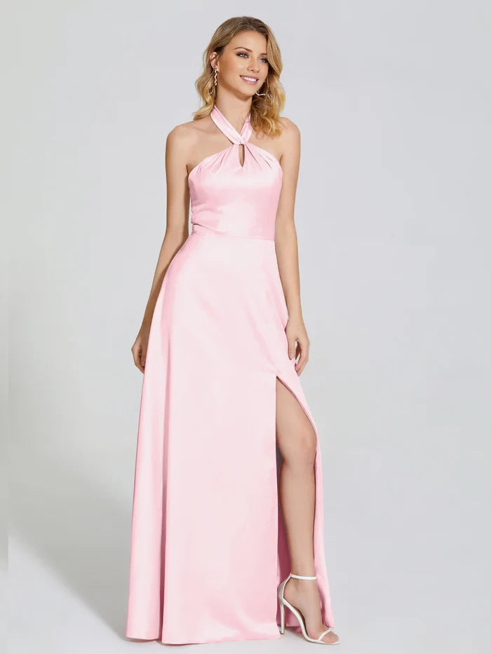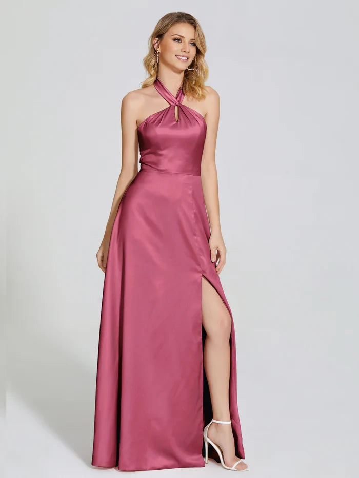 This satin bridesmaid dress features a V-neckline with delicate spaghetti straps, combining elegance and comfort. The Lola halter design includes a soft satin fabric and a stylish cutout detail, perfect for a sophisticated bridal party look.
