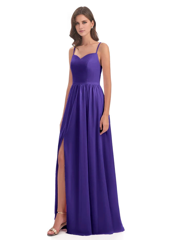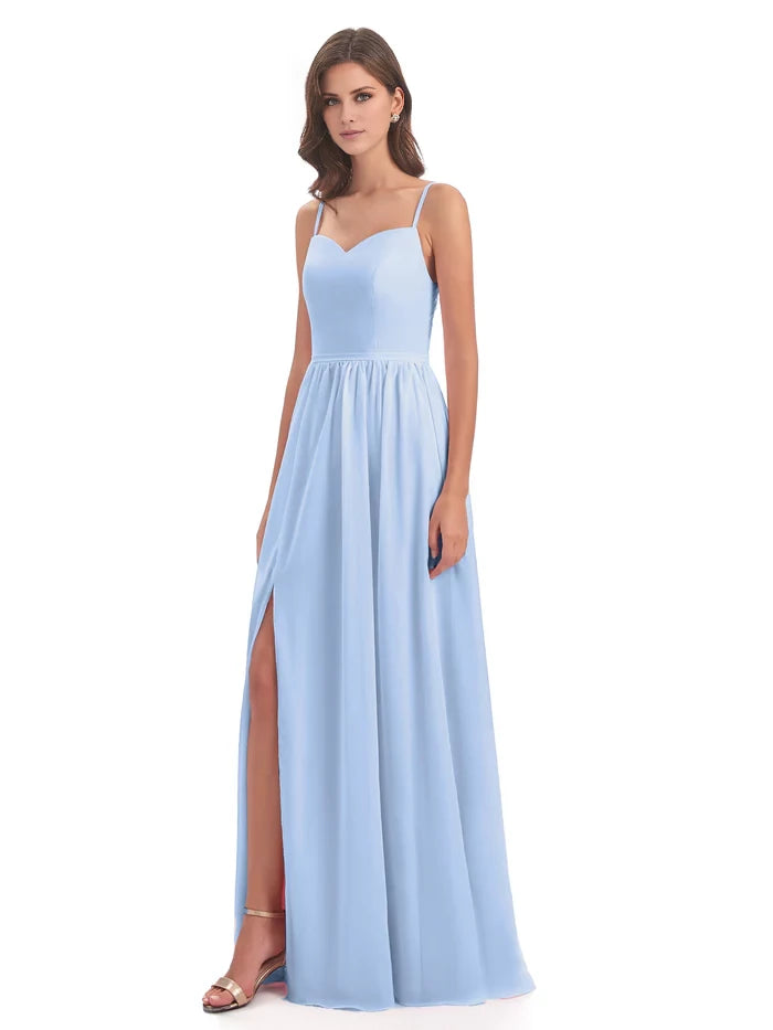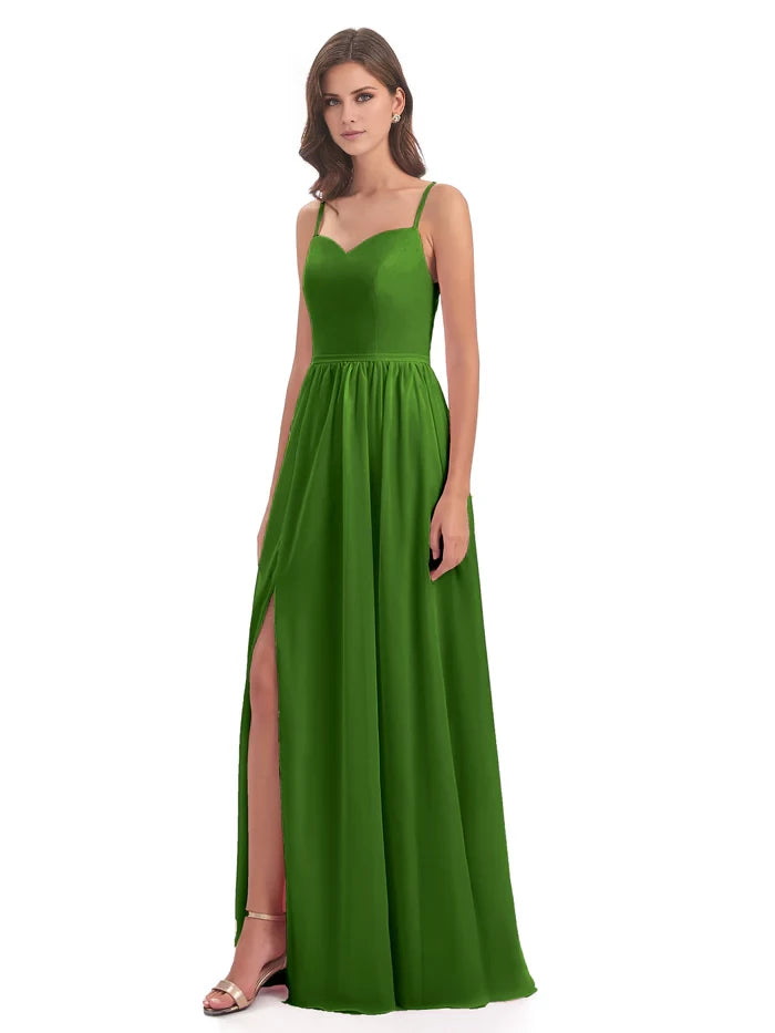 Elegant chiffon bridesmaid dresses featuring a V-neckline, delicate spaghetti straps, and a stylish split design.