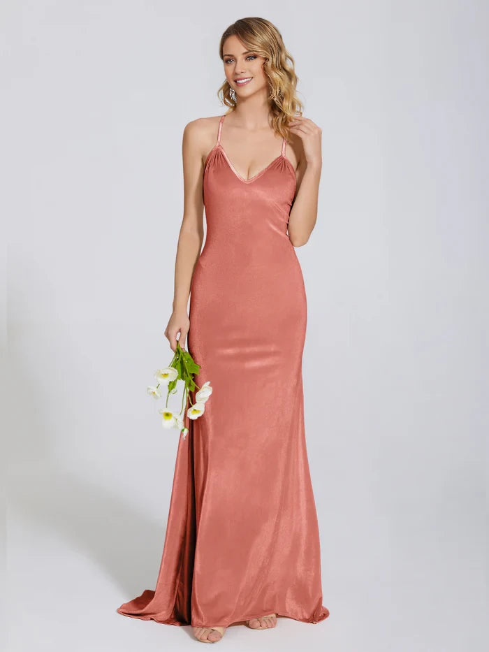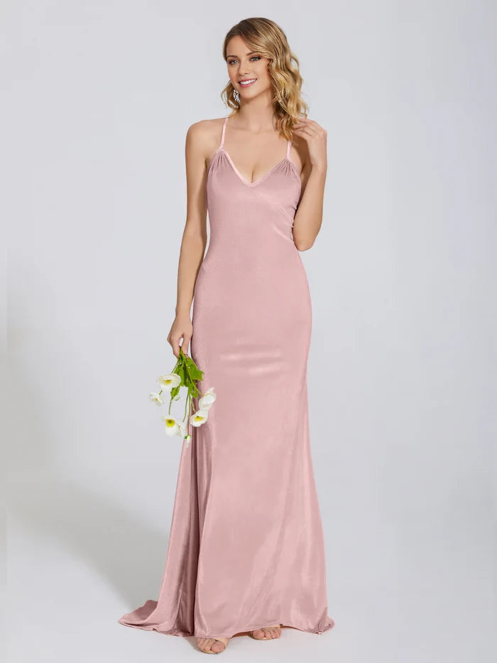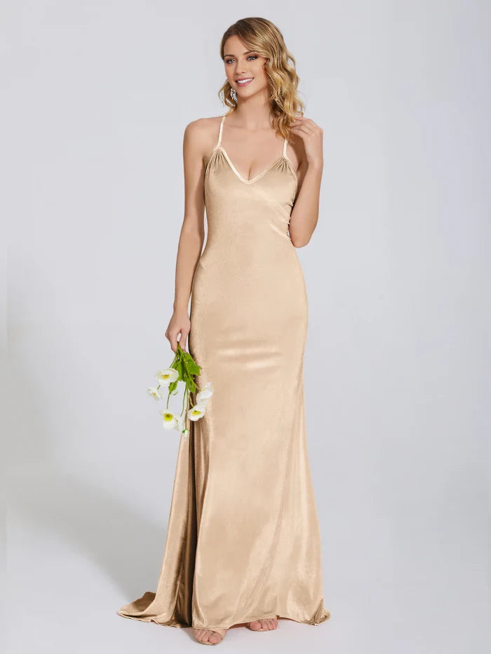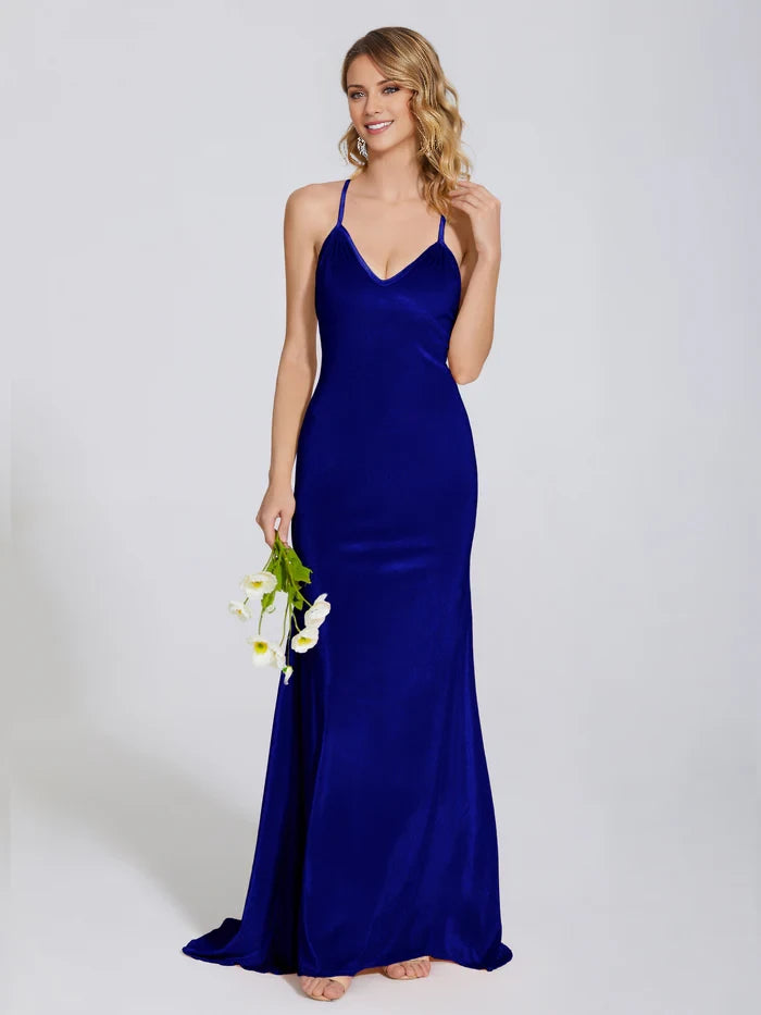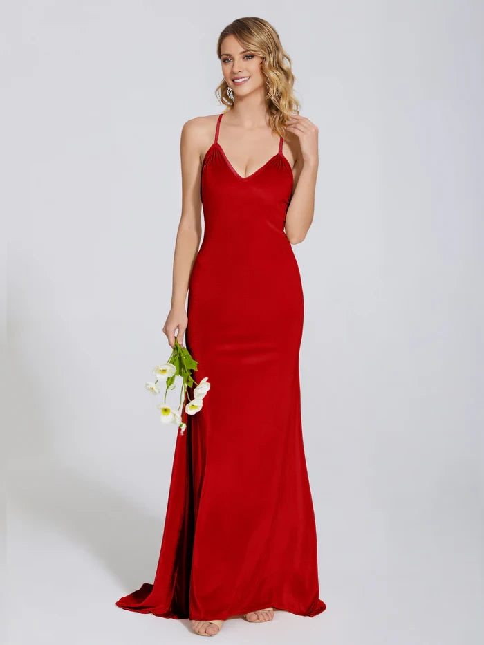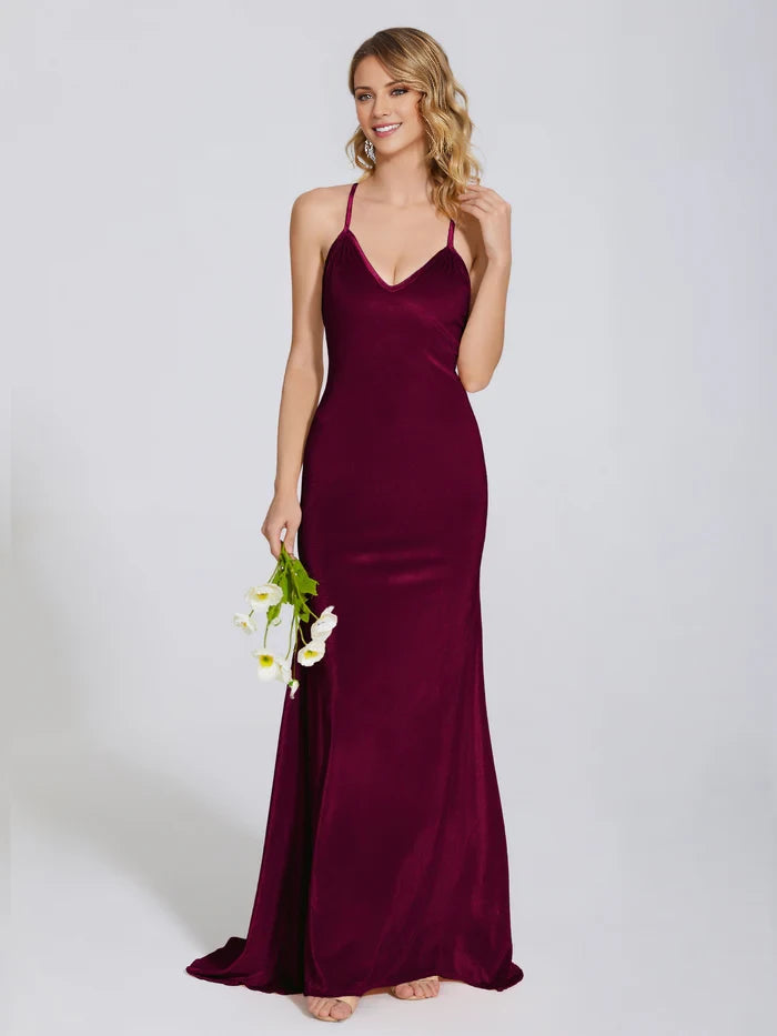 This bridesmaid dress features a velvet fabric with a trumpet silhouette, complemented by a V-neckline and delicate spaghetti straps for an elegant and refined look.