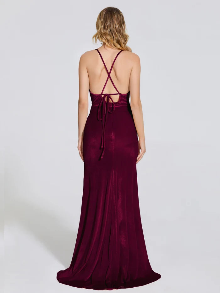 V Neck Spaghetti Straps Velvet Trumpet Bridesmaid Dress