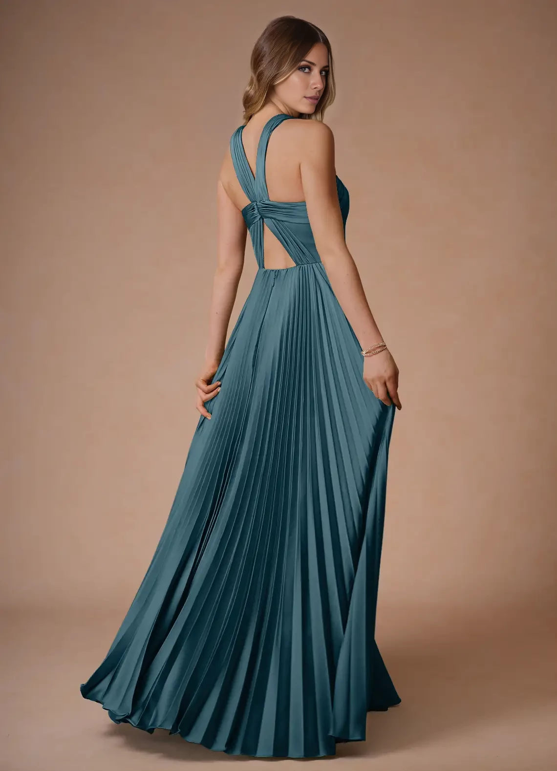 A-Line Pleated Satin Split Fork Dress Evening Dresses - Azure Blue / US 2 / UK 6 / EU 32