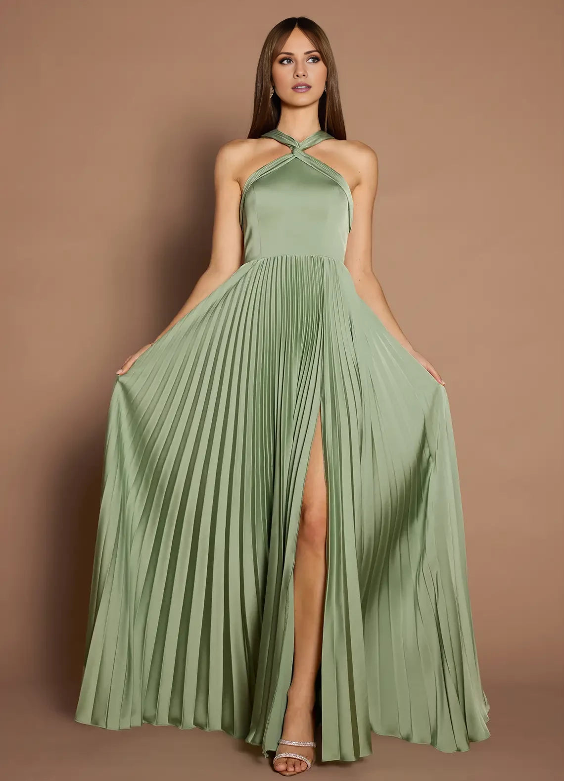 This evening dress features an A-line silhouette with pleated satin fabric and a stylish split fork design, combining elegance and sophistication for a refined look.
