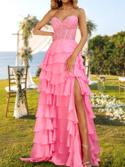 A-Line/Princess Strapless Crisscross Back Floor-Length Evening Dress with Sequins Split Side