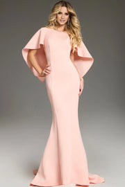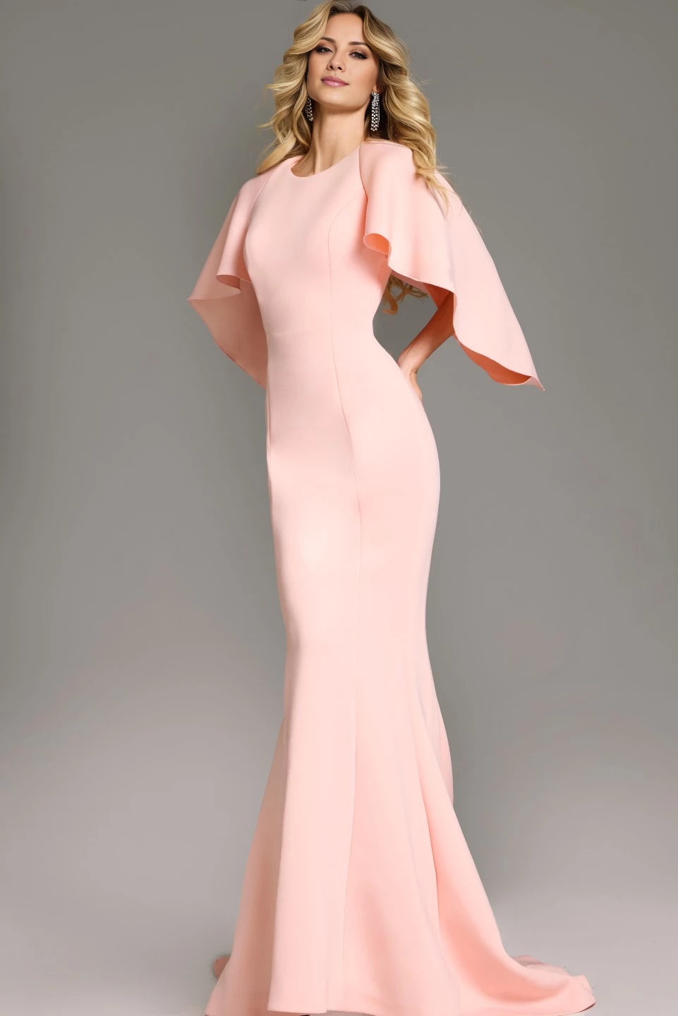 This evening gown features elegant cape sleeves paired with a timeless mermaid silhouette, creating a refined and sophisticated look for formal occasions.