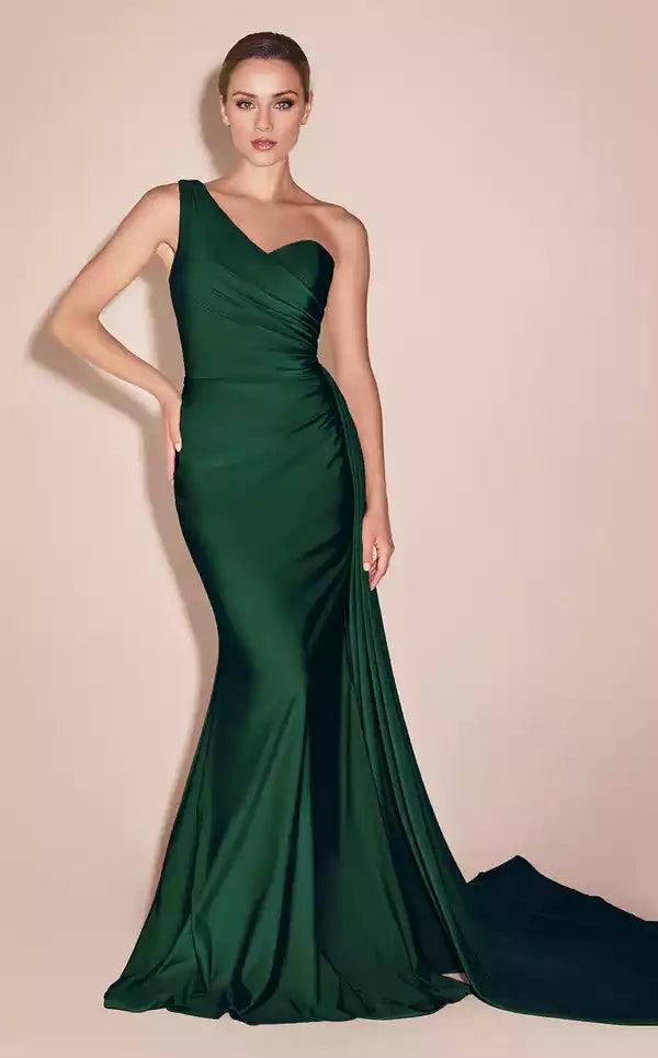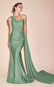 This elegant evening gown features a timeless one-shoulder neckline and a mermaid silhouette, combining classic design with sophisticated style.