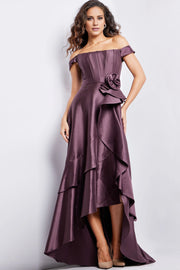 This evening dress features a corset bodice and an orchid hue, designed with a high-low hemline for a sophisticated and elegant look.