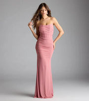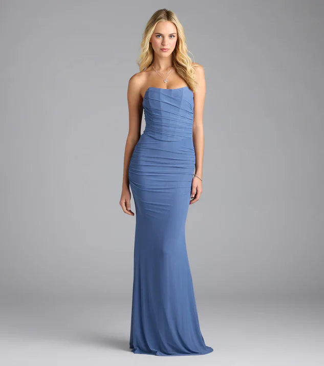 This evening gown features a corset-style mermaid silhouette with a mesh overlay that elegantly wraps around the hips, creating a sophisticated and flattering formal look.