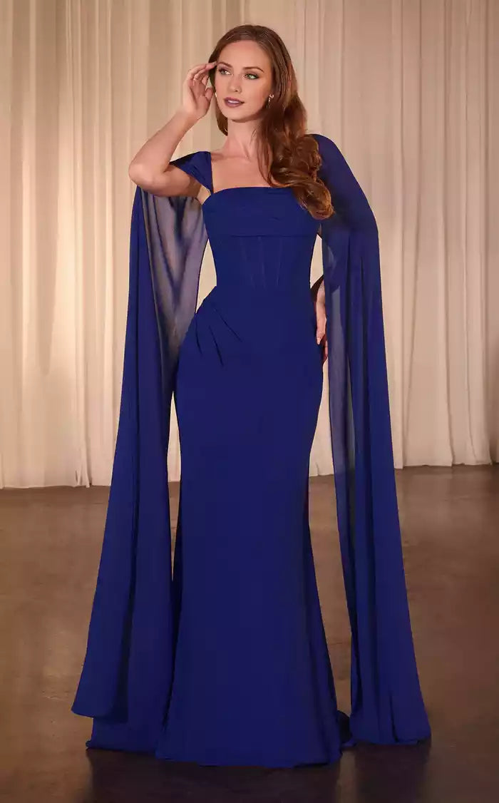 Elegant floor-length evening gown featuring a square neckline and a wrap design that gracefully covers the hips.
