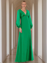 Elegant A - Line Plunging V - Neck Puff - Sleeve Zipper Back Floor - Length Evening Gown