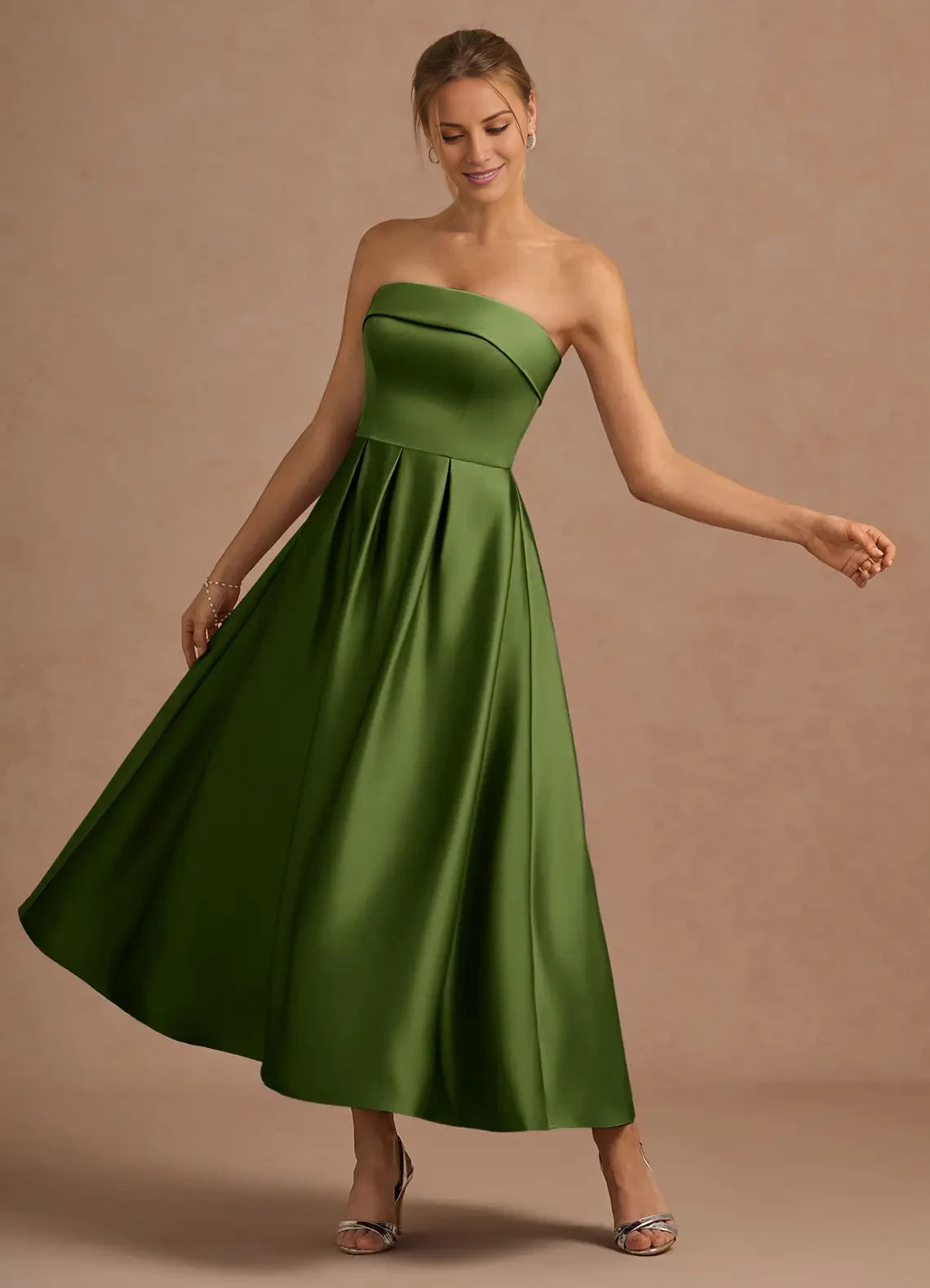 This sophisticated ankle-length evening gown features a strapless corset design with a flattering A-line silhouette.