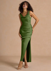 Elegant Cowl Neck Sleeveless Backless Ankle-Length Side Slit evening dress - Olive Green / US 2 / UK 6 / EU 32