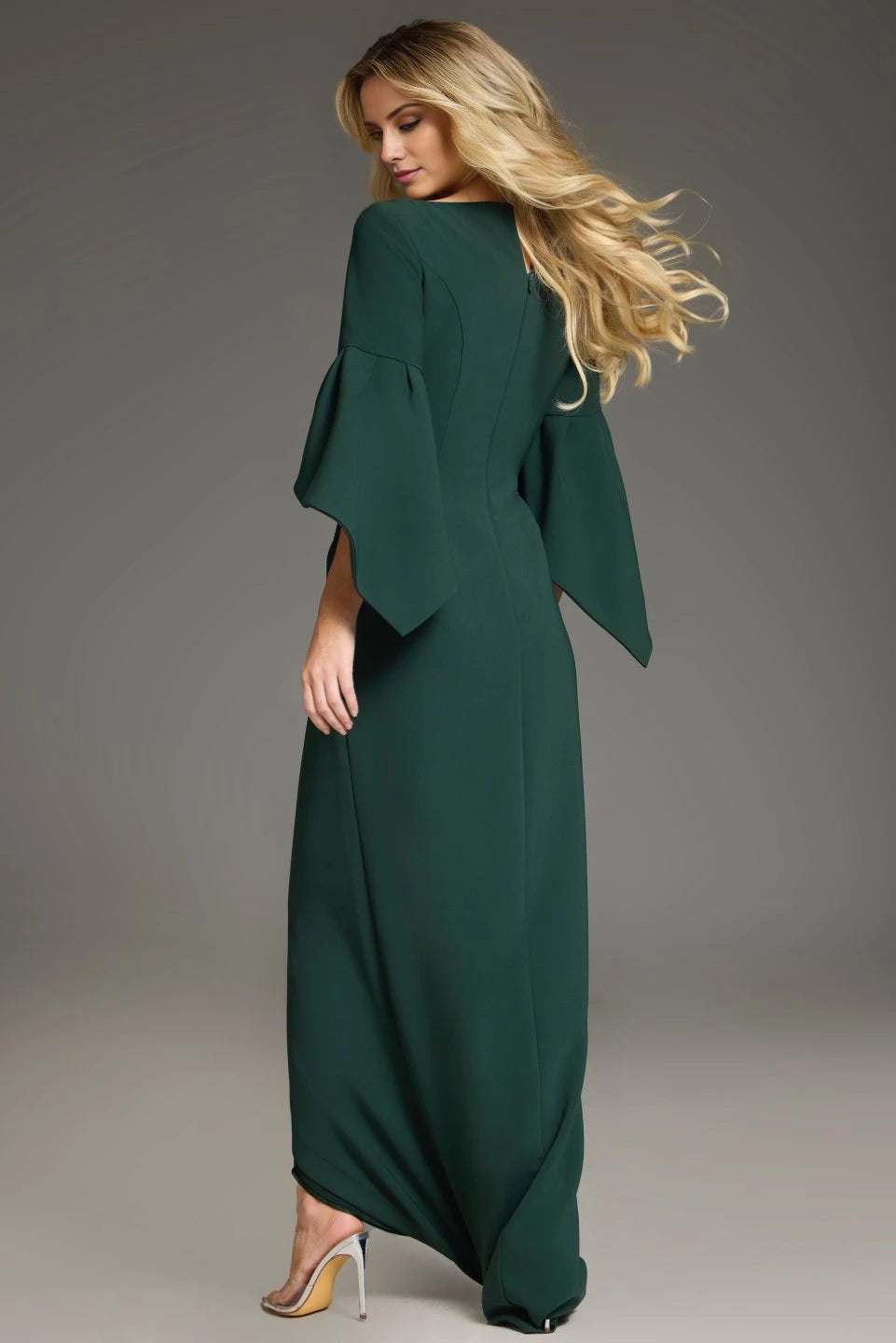 This sophisticated floor-length evening gown features graceful bell sleeves, combining timeless elegance with refined style for formal occasions.