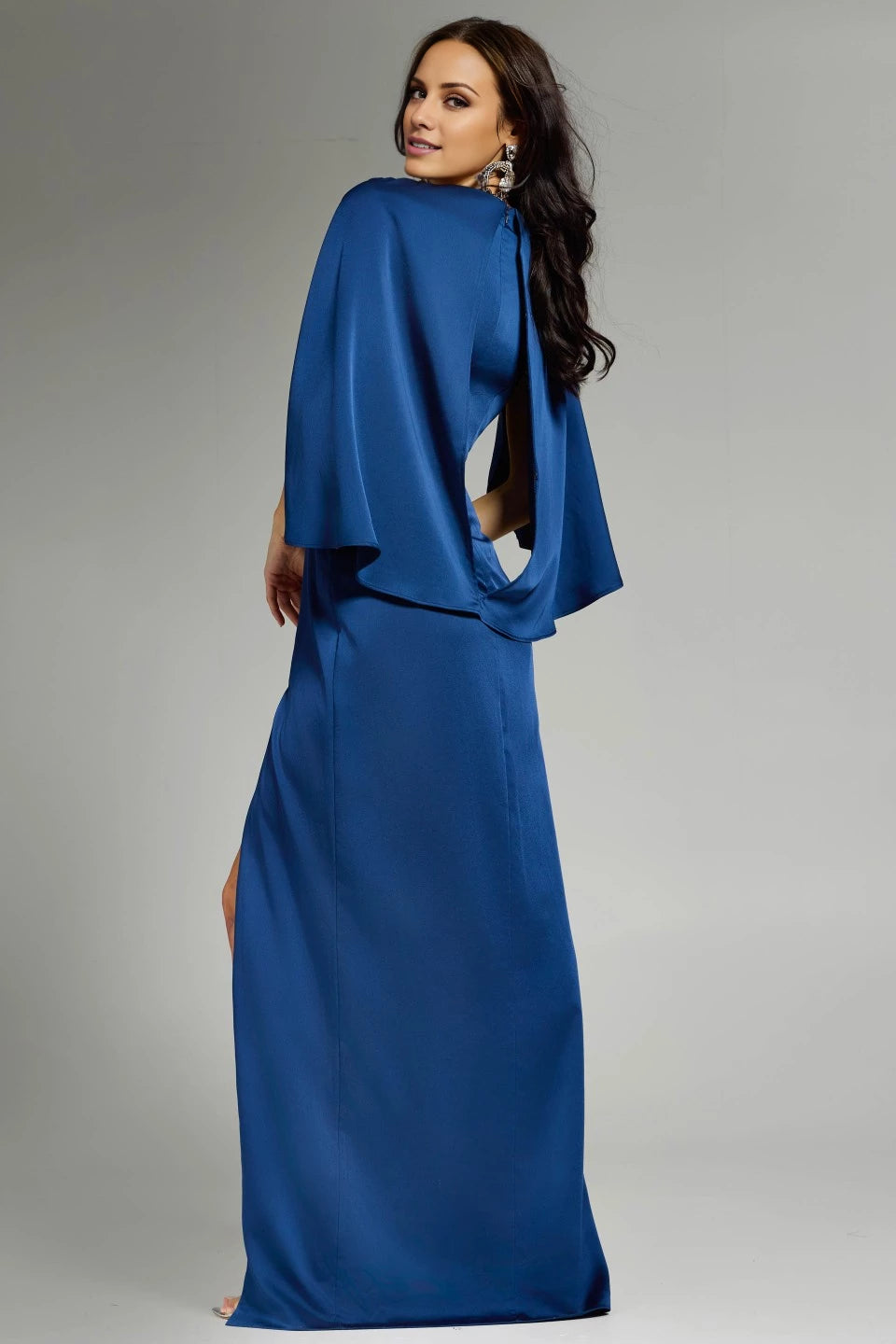 This sophisticated full-length gown features graceful cape sleeves and a delicately adorned waistline, combining timeless elegance with refined detailing.