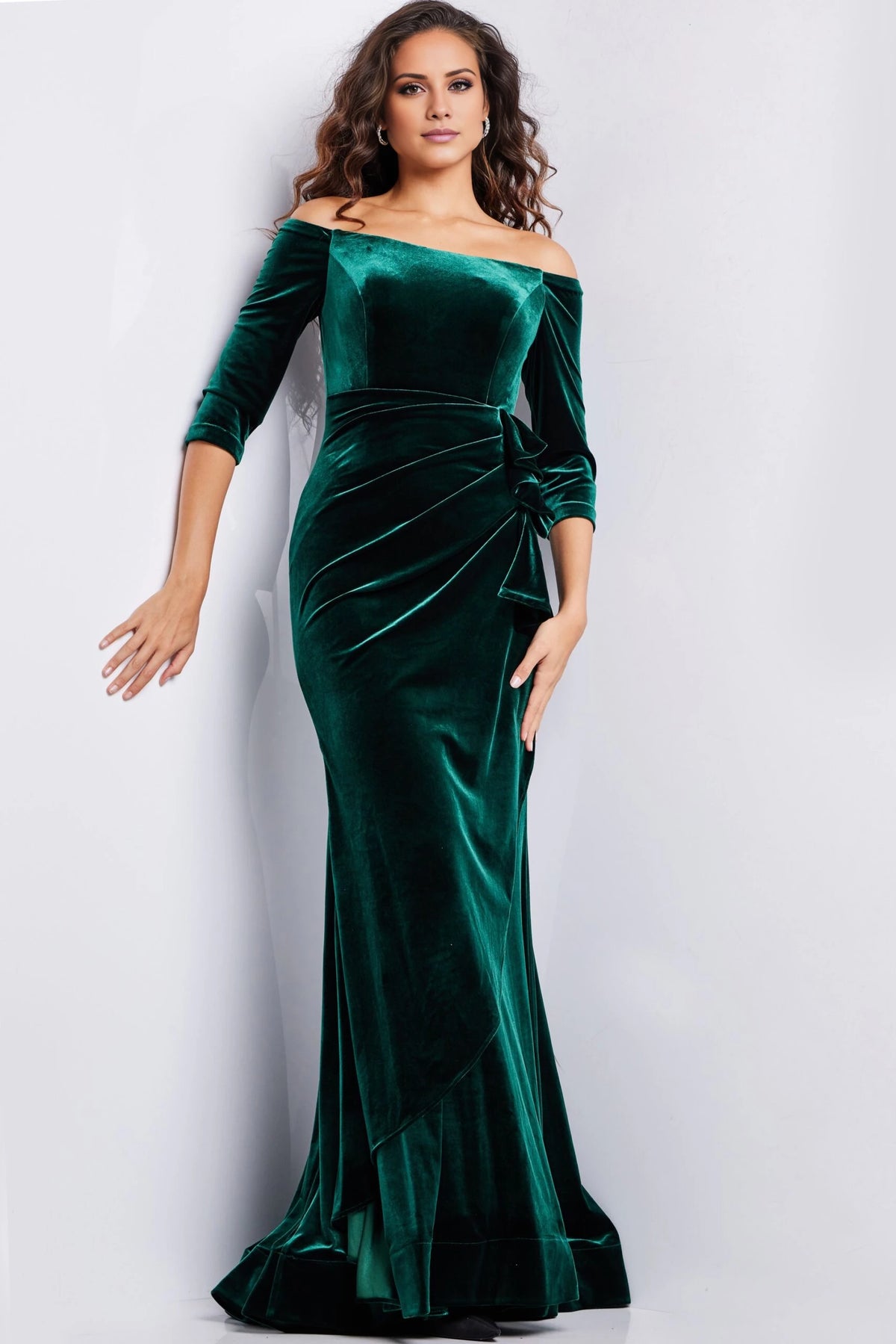 This evening dress features a luxurious emerald velvet fabric with elegant three-quarter sleeves, perfect for sophisticated occasions.