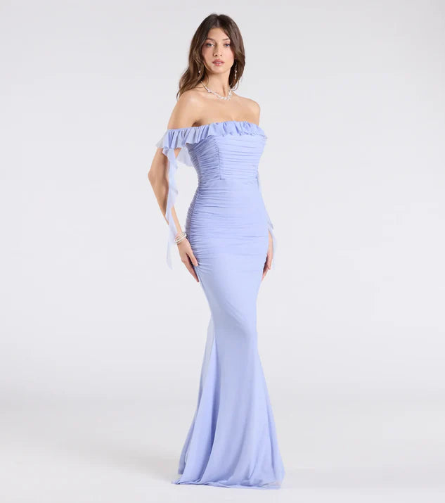 This elegant evening gown features a formal mesh design with an off-the-shoulder neckline and a long silhouette that gracefully wraps around the hips for a flattering fit.
