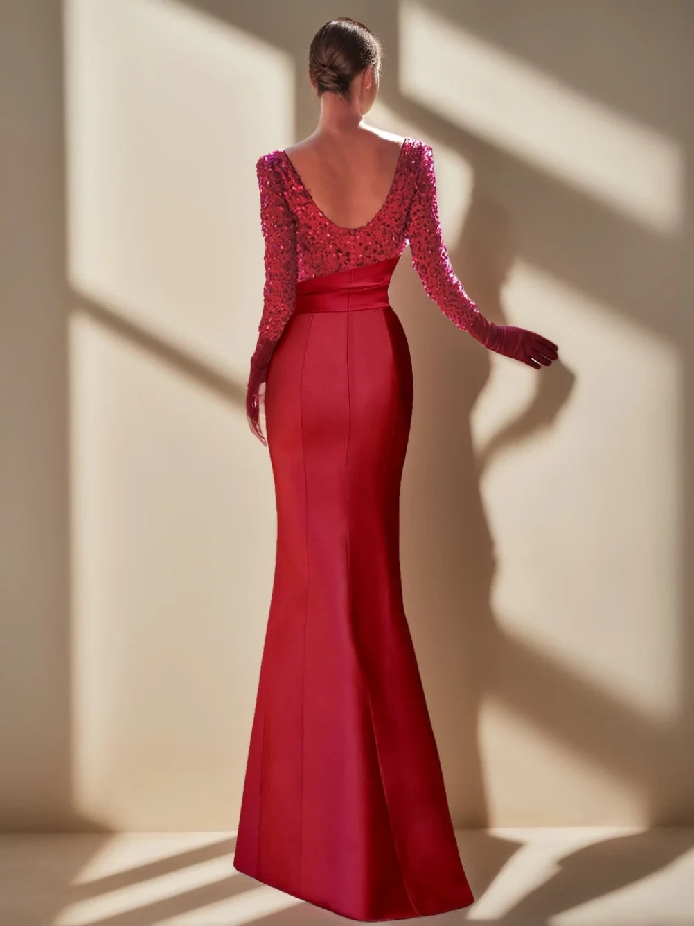 Make a dazzling statement with this glamorous mermaid evening gown. It features a boat neckline and long sleeves, with the top adorned in sparkling sequins for a touch of luxury. The open - back design adds allure, while the floor - length silhouette, with a ruffled side detail, hugs your curves beautifully. Perfect for galas, weddings, or any special evening occasion where you want to shine.