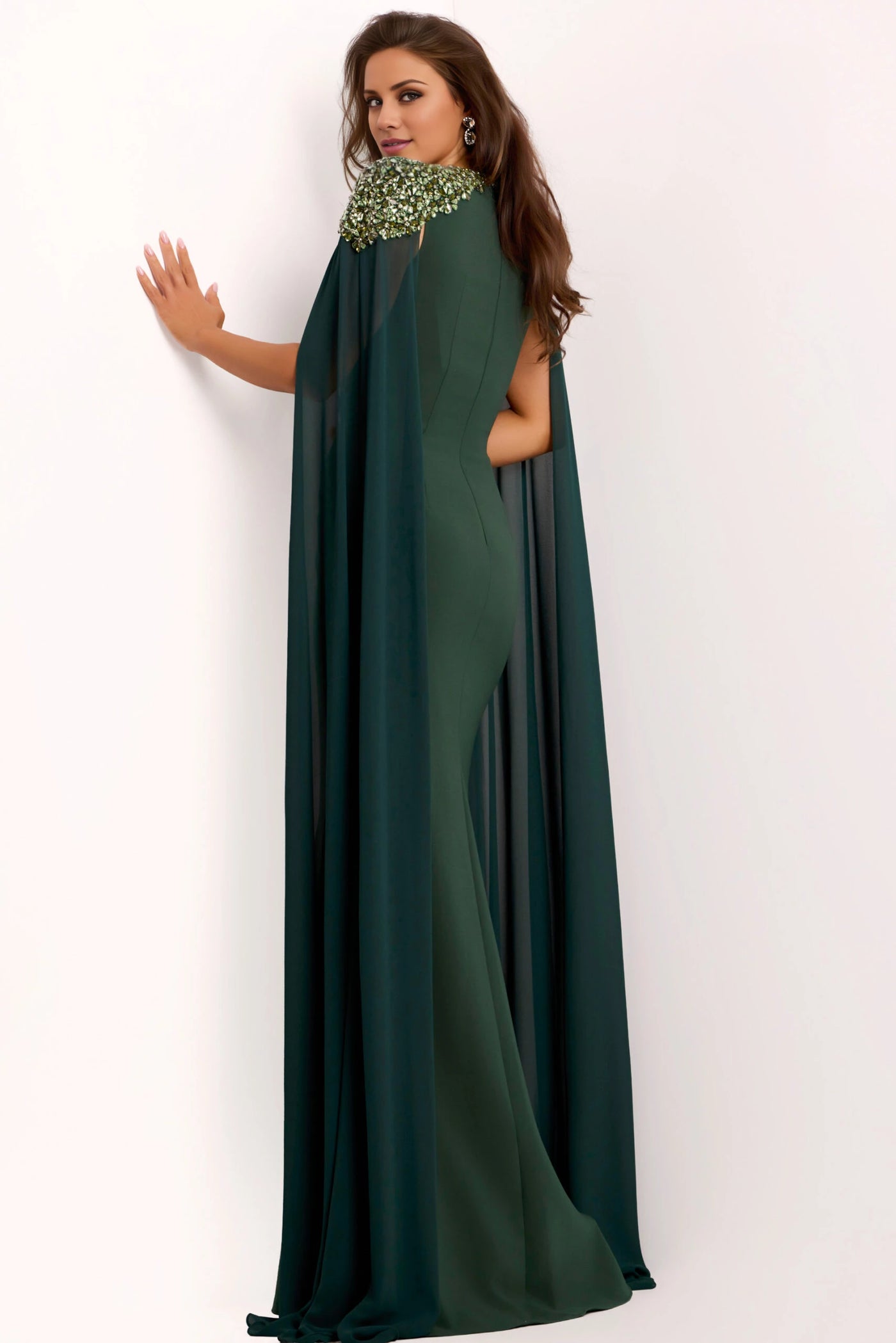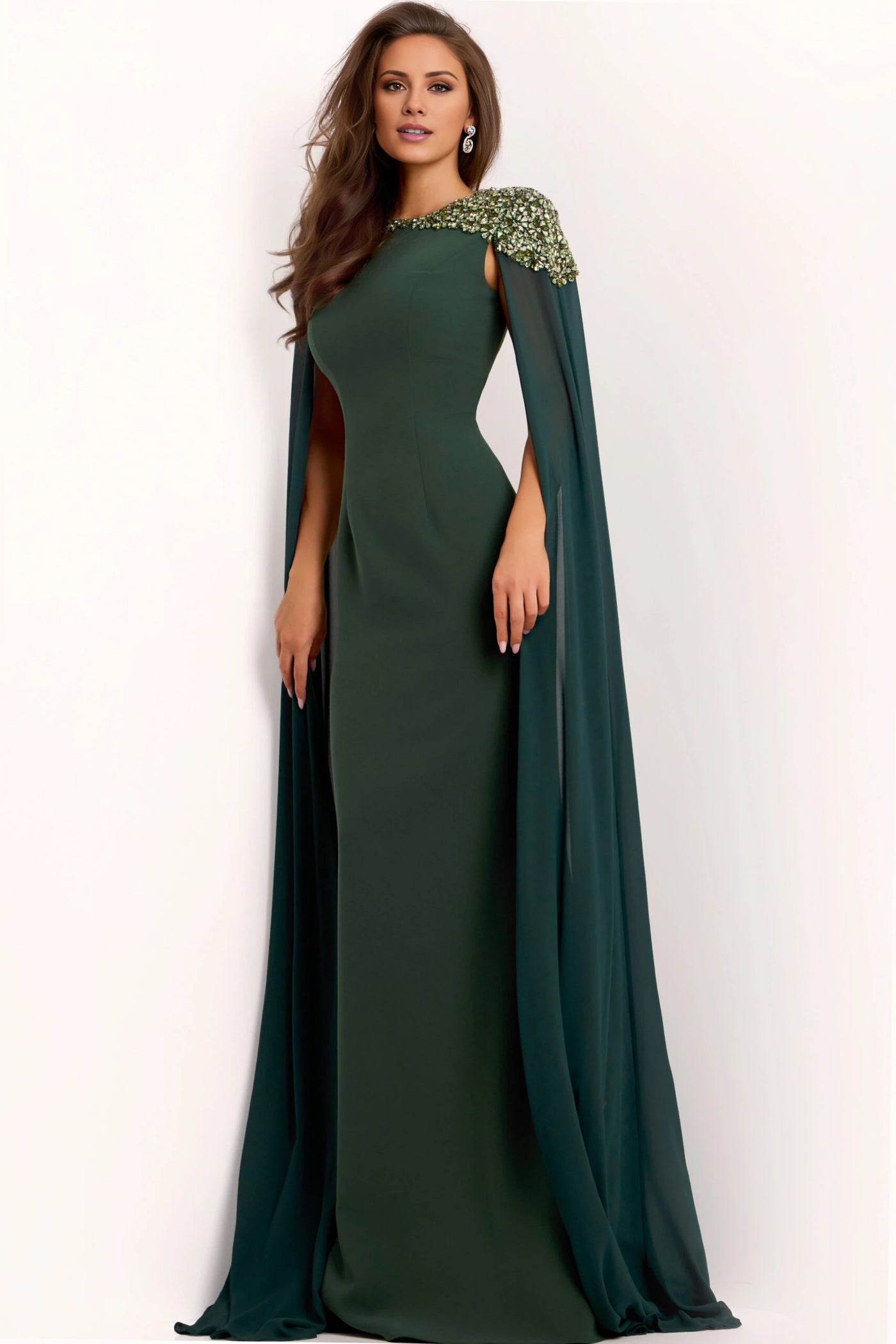 Elegant green evening gown featuring a cape design and intricately adorned shoulders for a sophisticated and striking look.