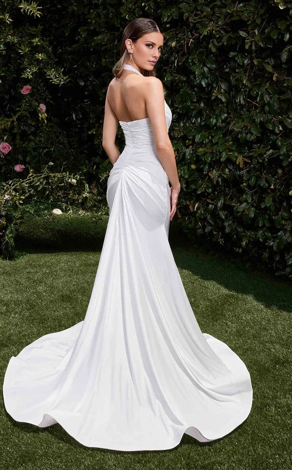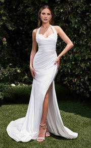 This floor-length evening gown features a halter neckline and a stylish split fork design, combining elegance with a modern silhouette for sophisticated occasions.
