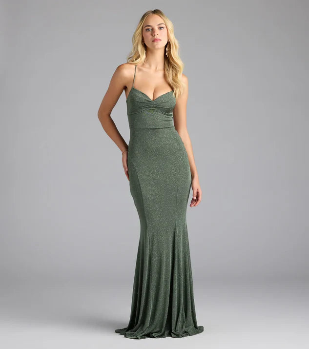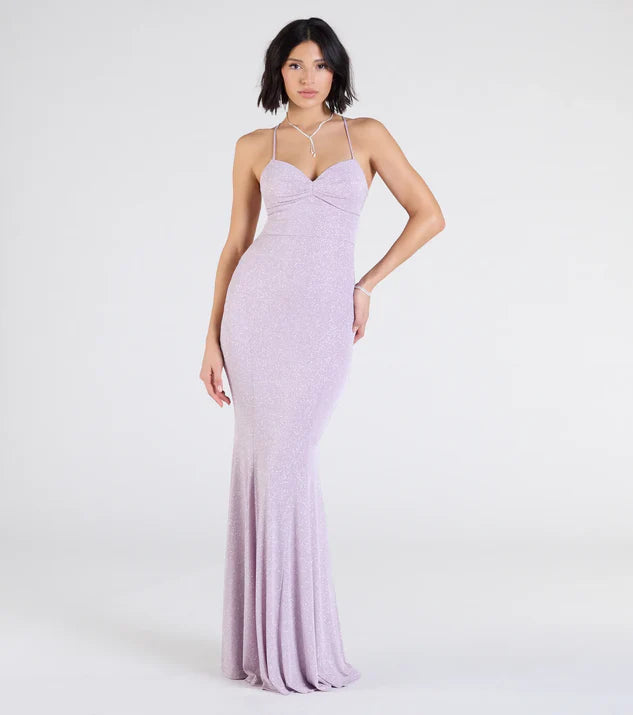 This formal evening gown features a lace-up design that wraps around the hips, showcasing a mermaid silhouette with shimmering glitter accents for an elegant and sophisticated look.