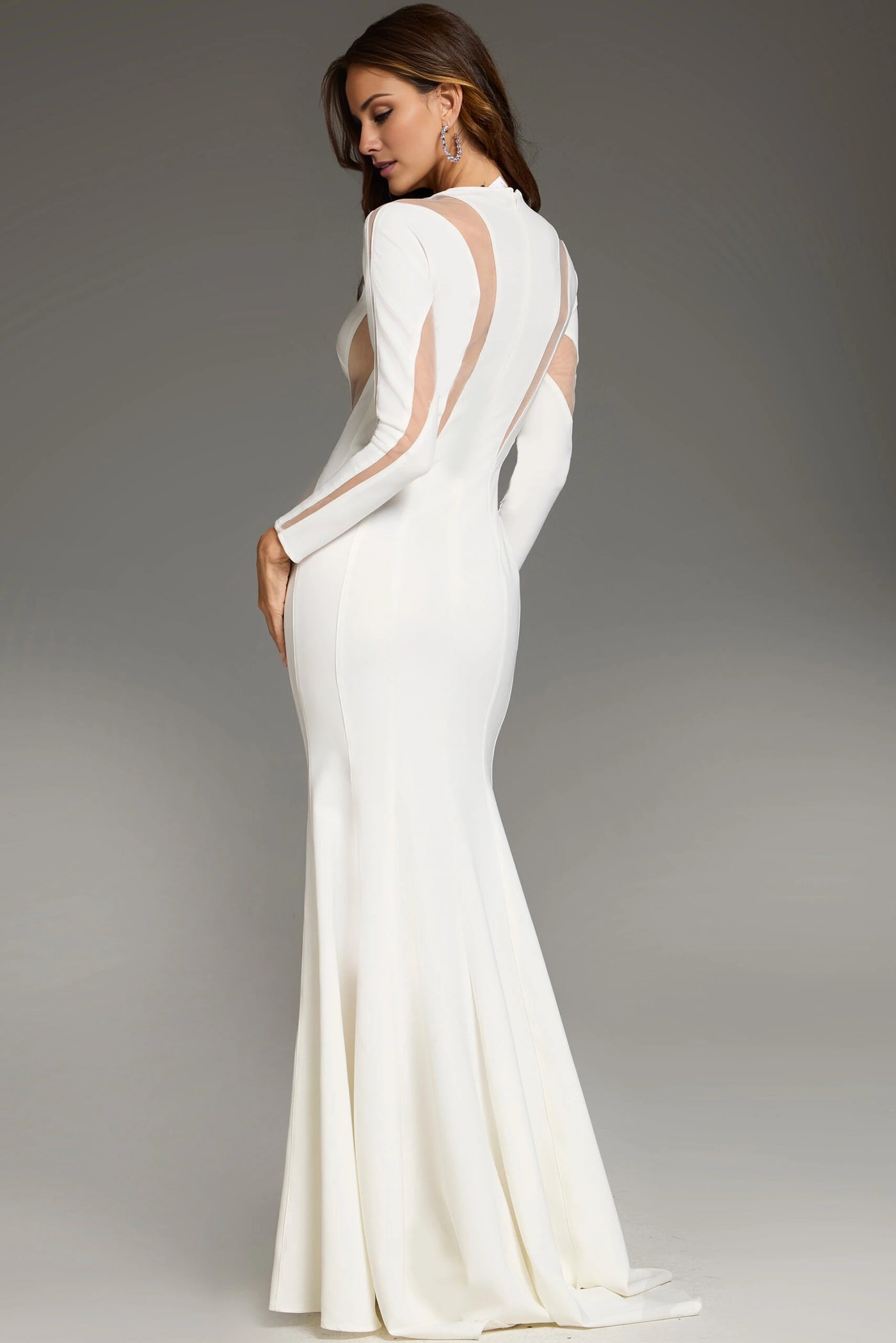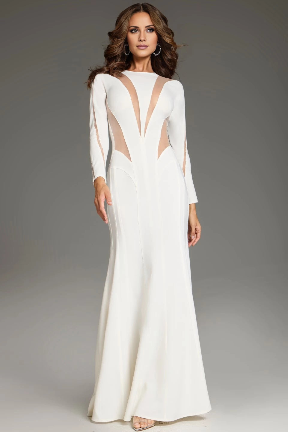 This evening gown features long sleeves and elegant sheer panel details, creating a sophisticated and refined look perfect for formal occasions.