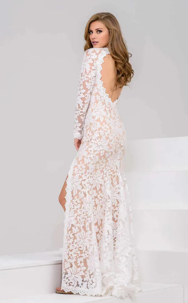 Luxury Sheath V Neck Long Sleeve Open Back Floor-Length Side Slit Evening Dress