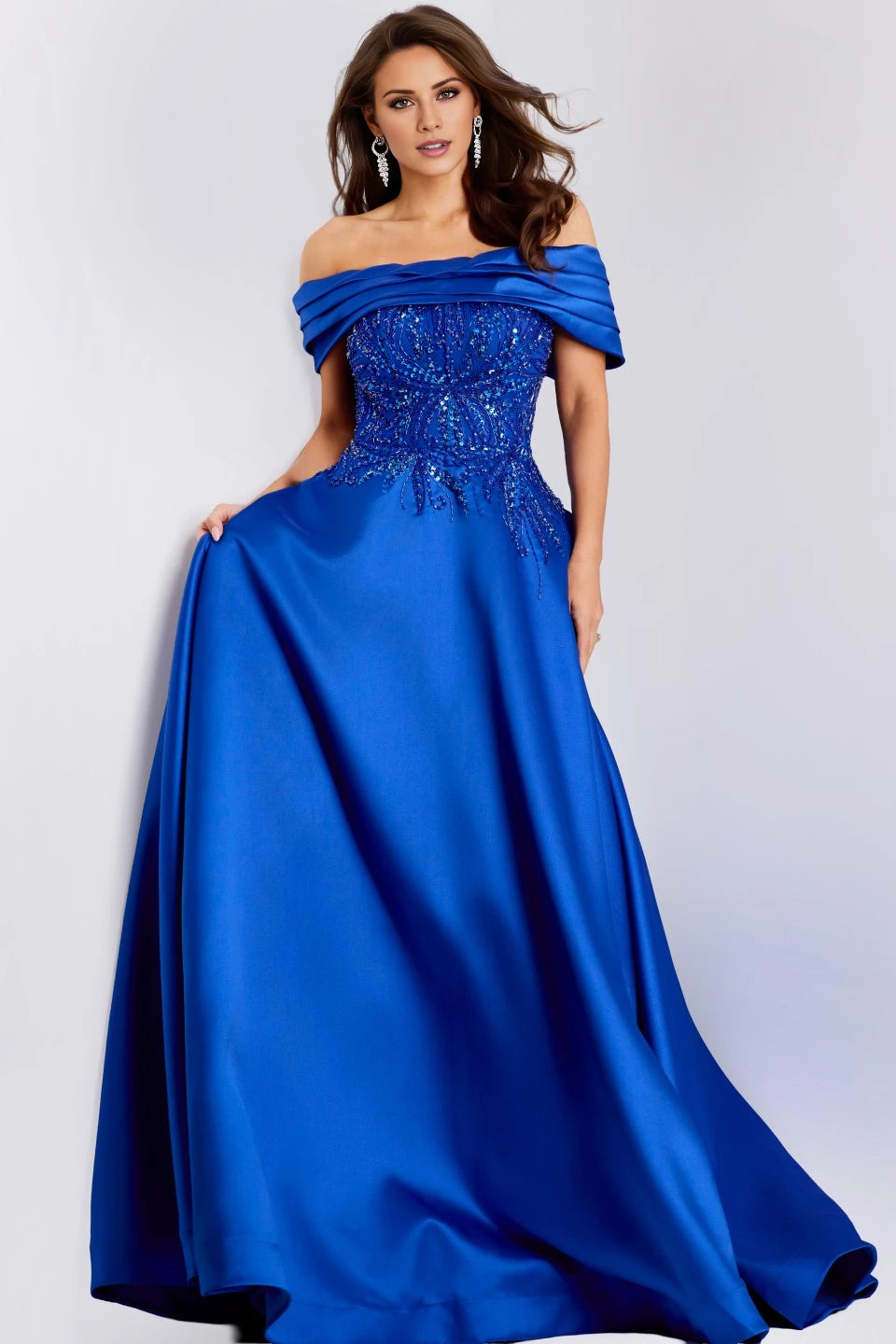 This off-the-shoulder A-line gown features a beautifully embellished bodice, perfect for elegant evening occasions.