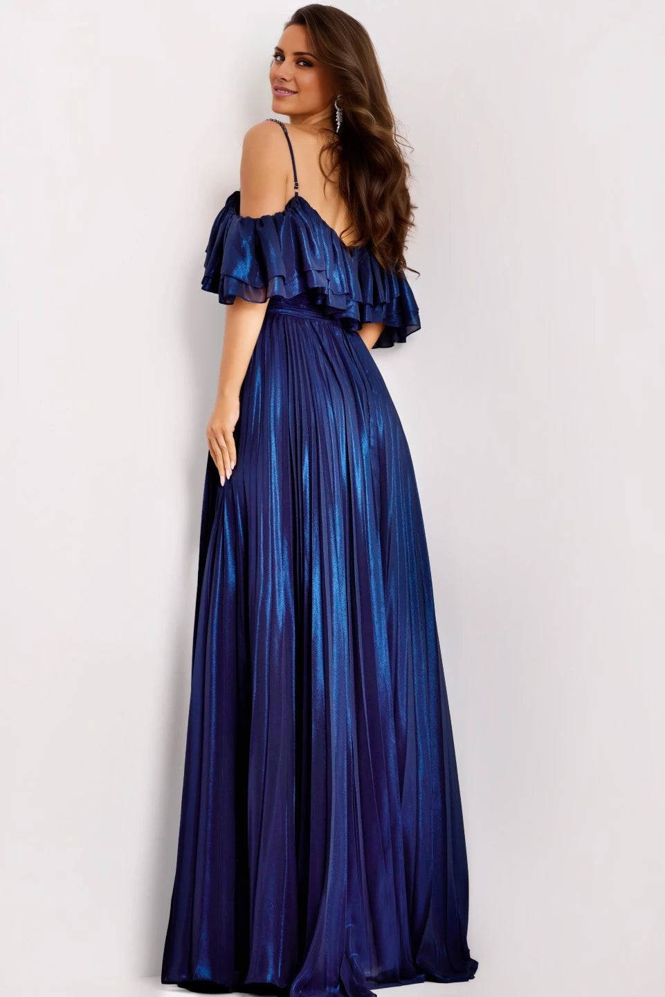 This elegant off-the-shoulder gown features an A-line silhouette and a delicately ruffled bodice, making it a sophisticated choice for evening occasions.