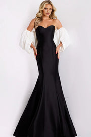 This elegant evening dress features an off-the-shoulder mermaid silhouette complemented by striking, dramatic sleeves for a sophisticated and memorable look.